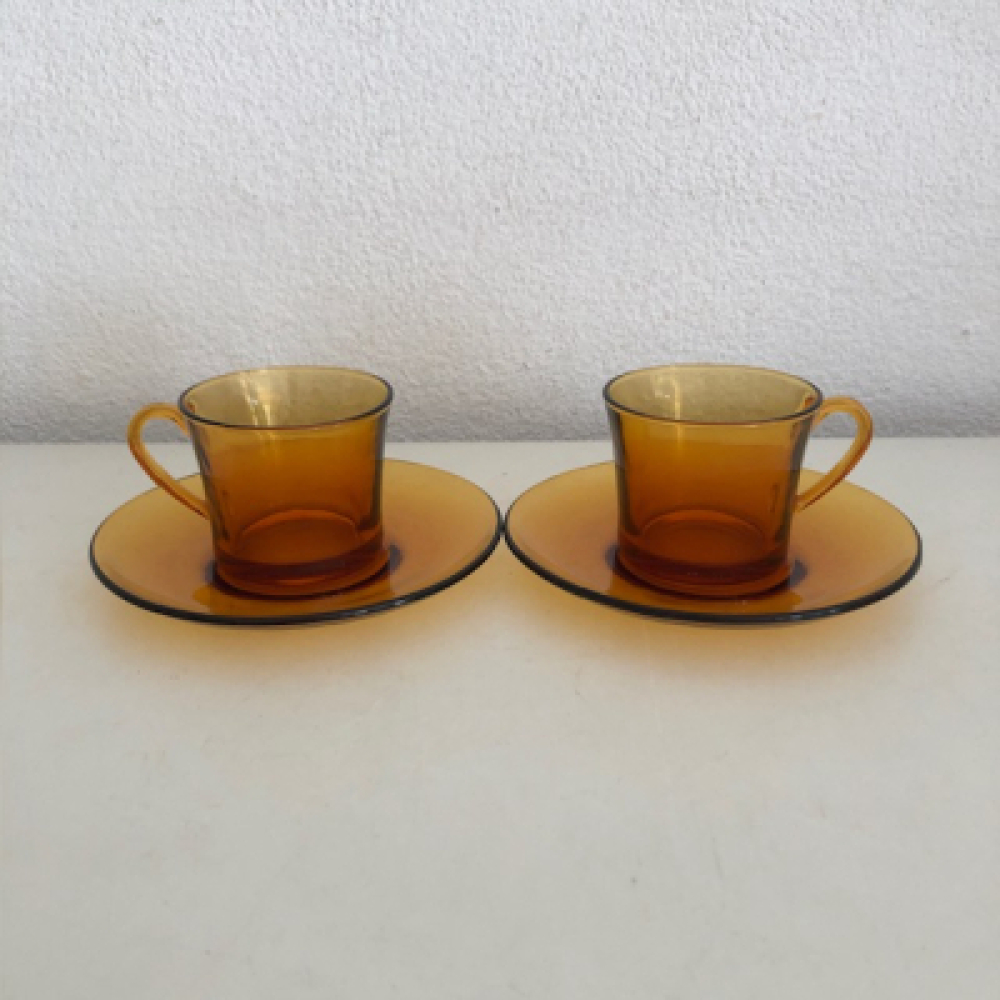 Funky set of 2 Duralex cups and saucers from France. Made of thick yellow glass from the sixties seventies.