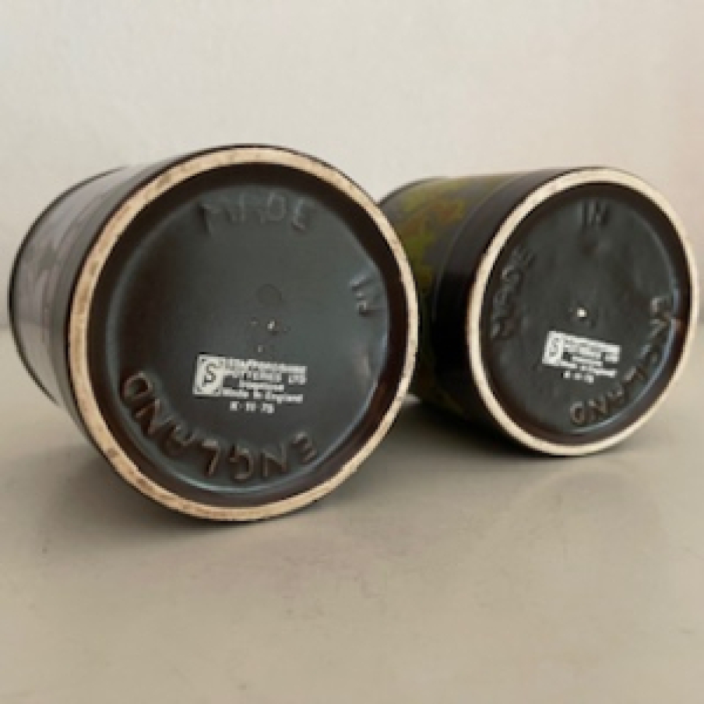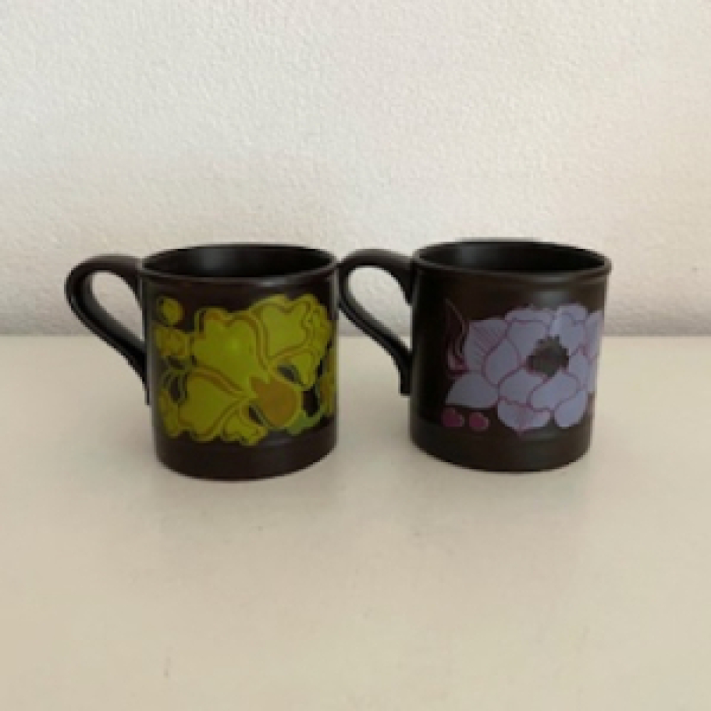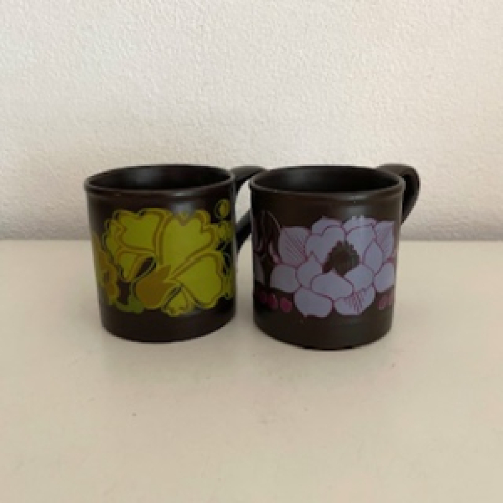 2 Flower power mugs from Staffordshire Potterie - Ironware - England. Original from the sixties - seventies. The pattern on the cups are green and purple flowers. Both mugs are in a good vintage used condition, see pictures. The pictures are part of the description.