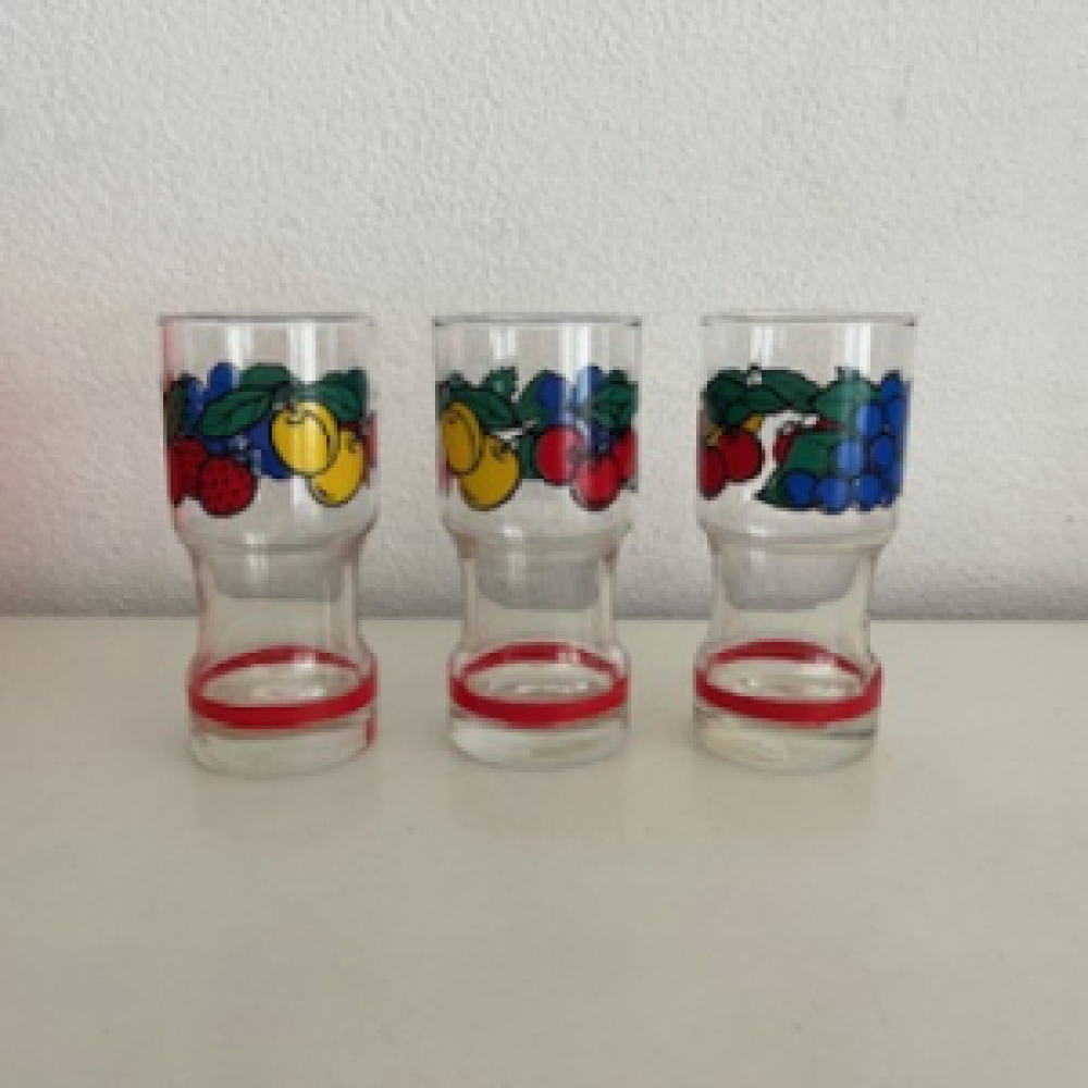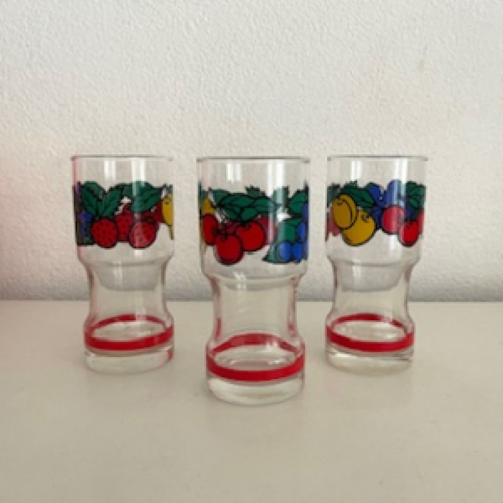 Beautiful juice glasses with fruit pattern: strawberries, cherries, peaches and grapes. Original from the seventies and perfect for a retro kitchen / interior. The longdrink glasses are in a very good vintage condition, see pictures. The pictures are part of the description.