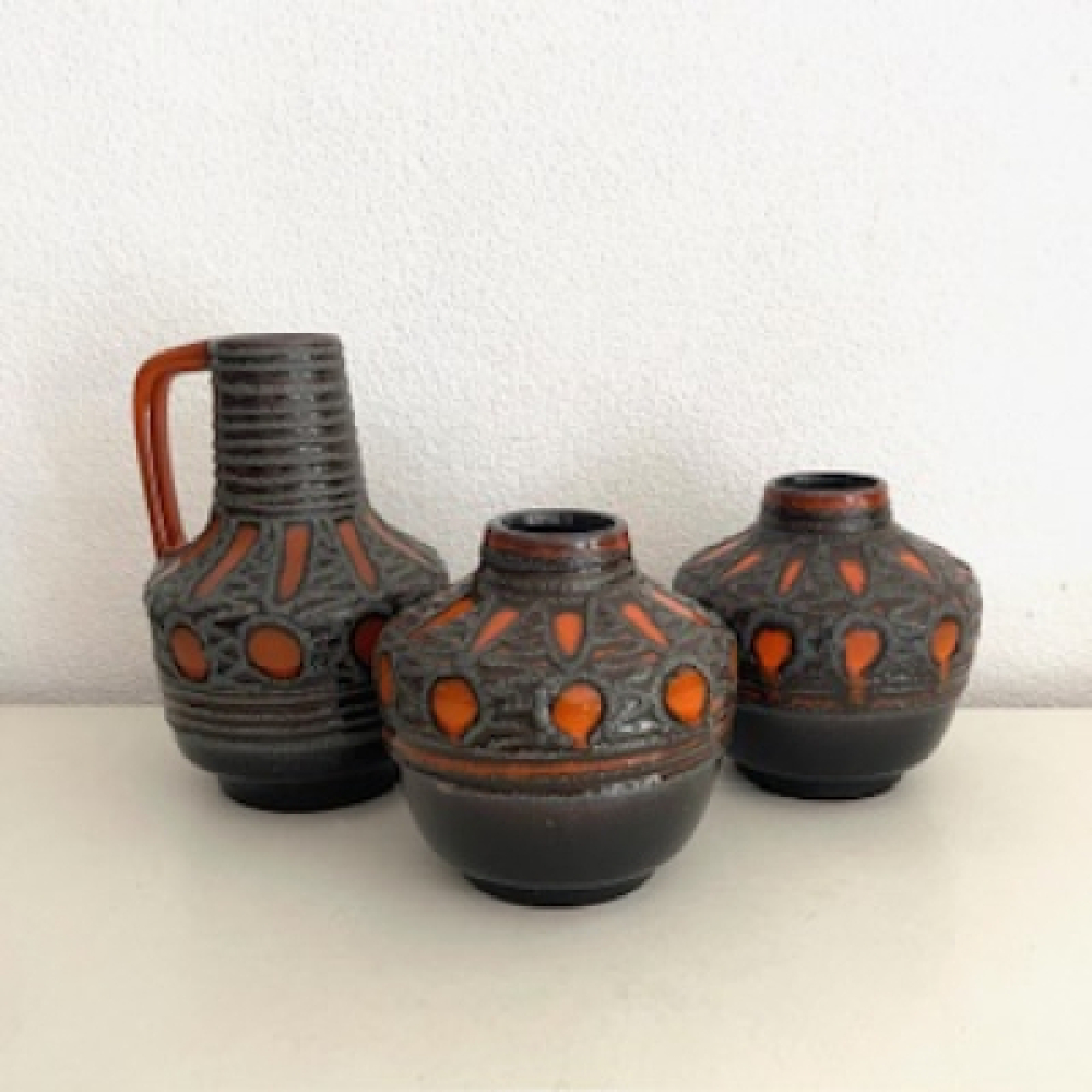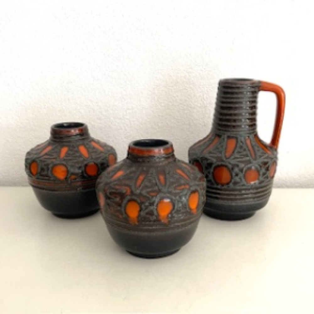 Three beautiful vintage Fat Lava vases made by: VEB Haldensleben - Germany. Original from the sixties seventies in a dark brown with orange with brown / grey fat lava decor. All 3 vases are in a very good vintage used condition, see pictures. The pictures are part of the description.