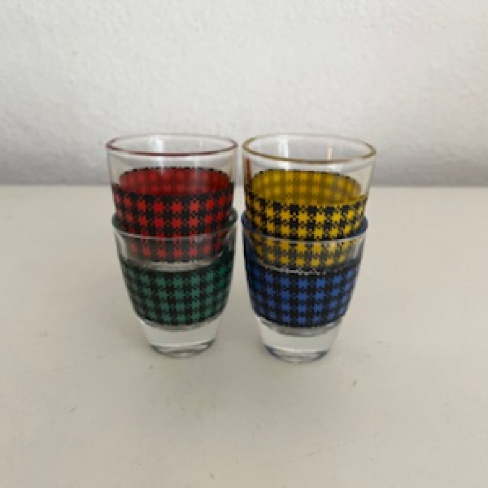Cool liquor glasses from the sixties with checkers 60s print. The glasses can be used as shot glasses or to serve a liquer in. This set contains 4 small glasses in 4 different colors. They are in a good vintage used condition, see pictures. The pictures are part of the description.