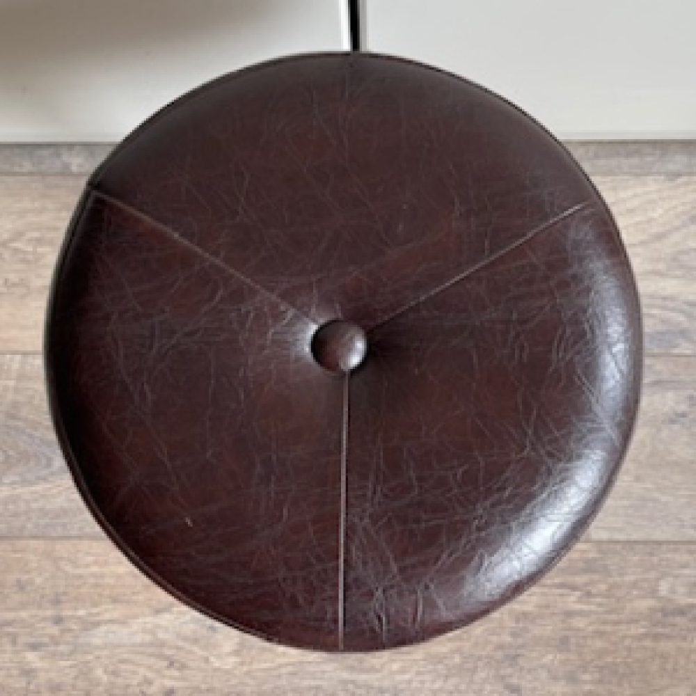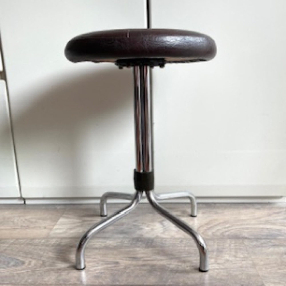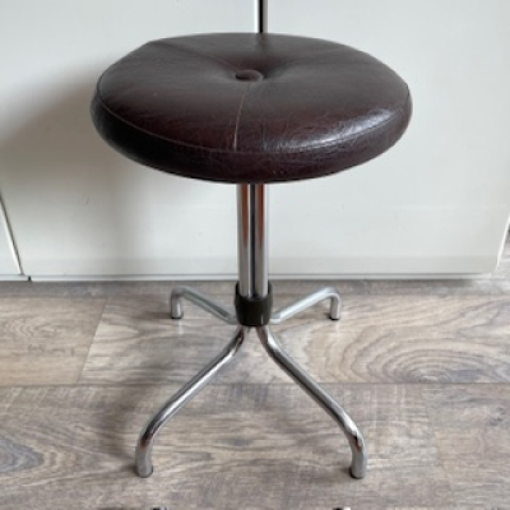 Beautiful vintage Brabantia brown stool from the seventies. The stool has a chrome metal frame with brown skai leather rotating seating. The foot cross has black plastic caps on the bottom.