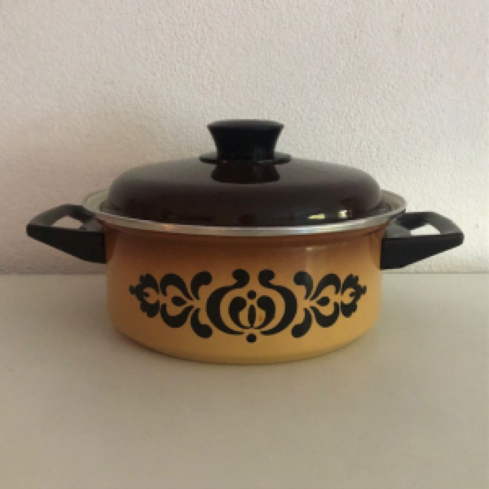 Brown psychedelic flower design with black bakelite handles and top on the lid