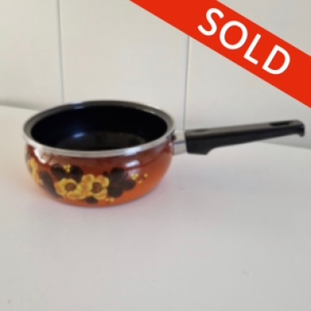 The beautiful saucepan in brown with yellow, orange and brown coloured flowers is a rare find.