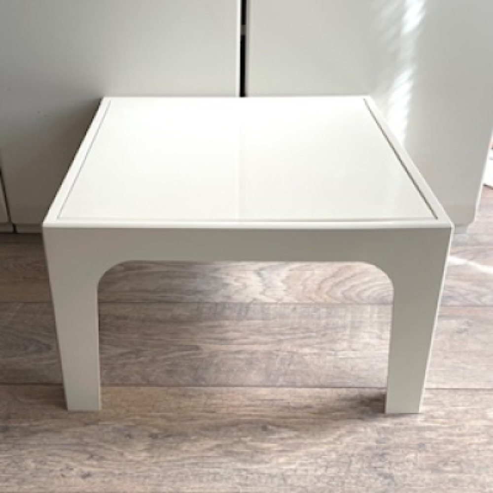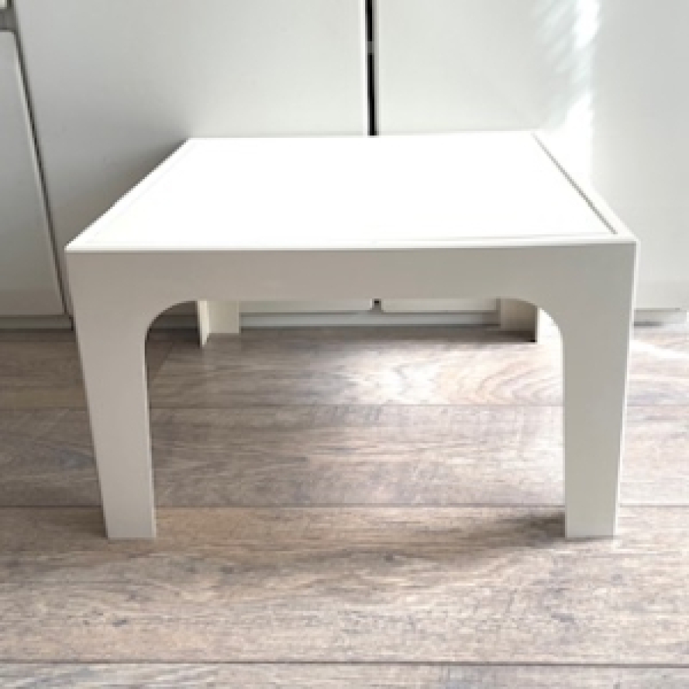 Plastic creme white side table; cool vintage item by Flair Plastics, original from the sixties seventies in a Space Age design. Because it is made of plastic it can easely be used in the bathroom. The table is in a vintage used condition; it has some discoloration and has traces of use, see photos. The pictures are part of the description.