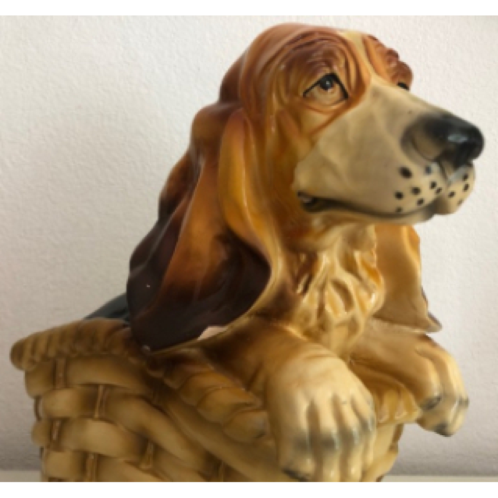 Beautiful large ceramic dog statue. Probably a Basset, Cocker Spaniel or a Beagle in a 'rattan' basket. The dog XL statue is in a vintage used condition and has some signs of usage and aging, see pictures. The pictures are part of the description.