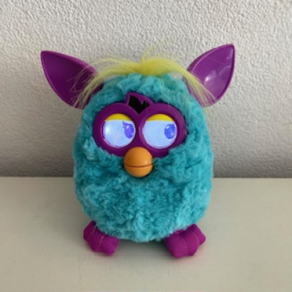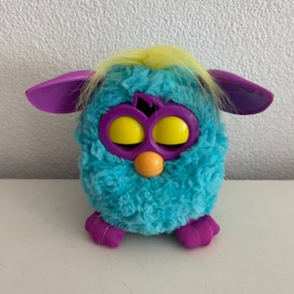 A real collectors item! Aqua blue with purple (violet) Furby made by Hasbro in 2012. This Furby has its original label.