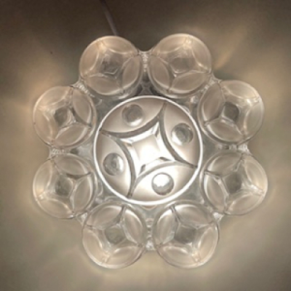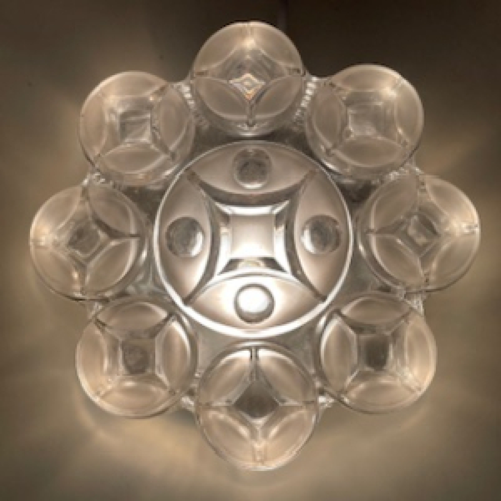 Gorgeous design ceiling or wall lamp made by the German glass company Willa. The lampshade is made of thick glass and the design looks like a cool geometric flower. It is completely original from the sixties. This is a rarely seen lamp, so when you come accross this beauty it is almost impossible to not fall in love with it. The pictures say it all. The Willa lamp is in very good condition, see pictures. The pictures are part of the description.