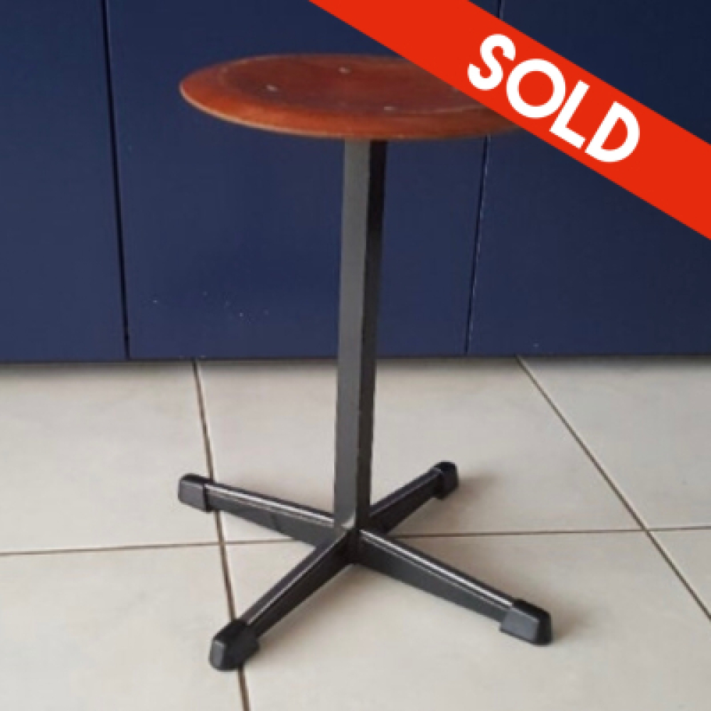 Vintage industrial stool from the fifties / sixties made of heavy metal with a plywood seating (round pressed wooden seat)