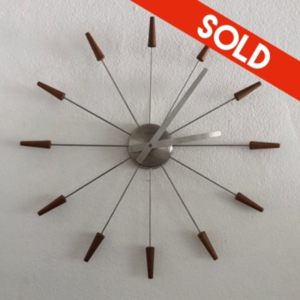 Retro design clock to hang on the wall. Brushed steal with teak wooden cones on the ends