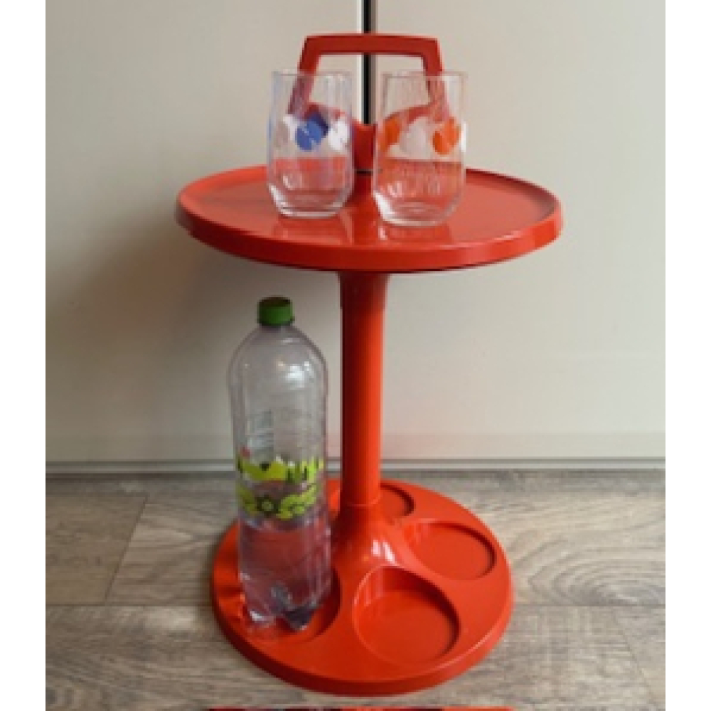 Plastic orange mobile side table, bottle rack with a handle on top and space for 5 bottles.