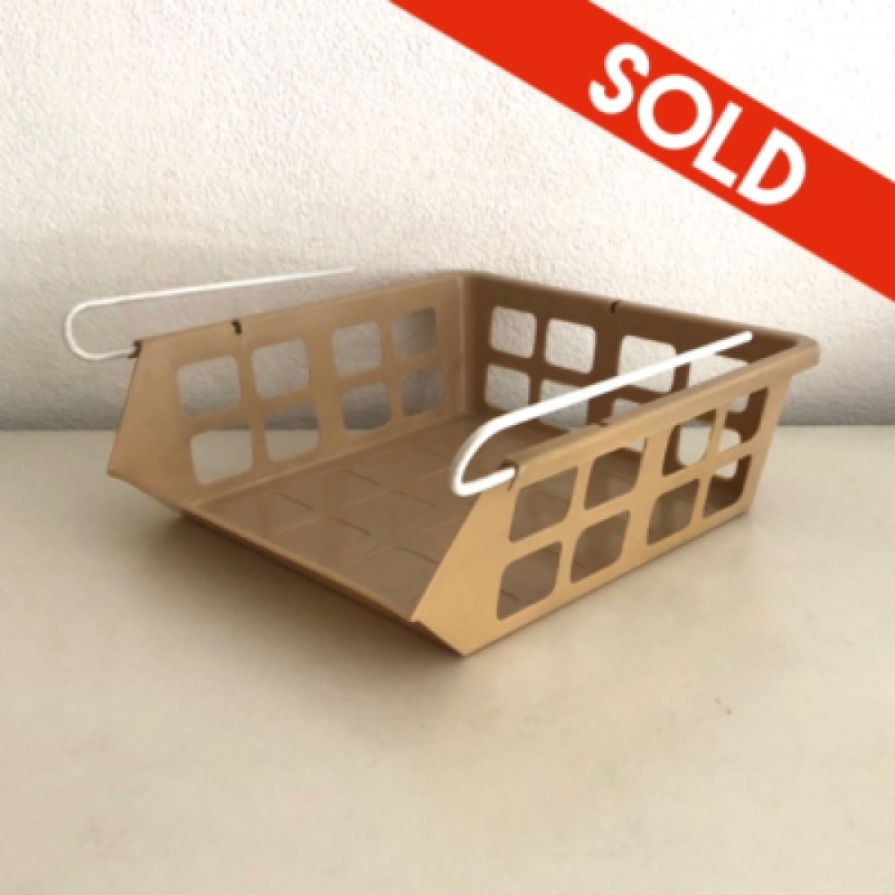 Vintage shelve rack from the seventies. This rack can slide on to a shelve and that way it hangs on to it for some extra storage space. For example: extra shelving for socks in your wardrobe. We have different sizes and colors available, just have a look at our other advertisements.