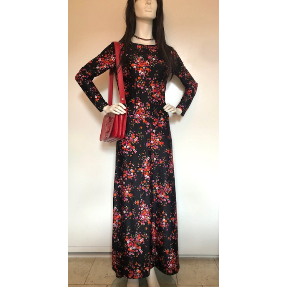 Original vintage maxi dress with long sleeves in a black and red floral seventies pattern.