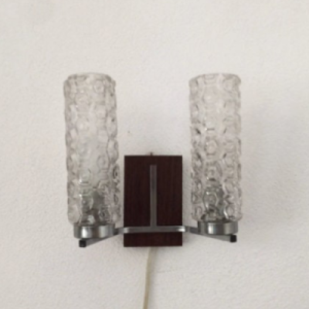 Gorgeous fifties sixties wall lamp. Transparant glass lamp shadeshave honeycomb, heaxagon shapes in the thick glass, chrome metal and wooden wall rack.