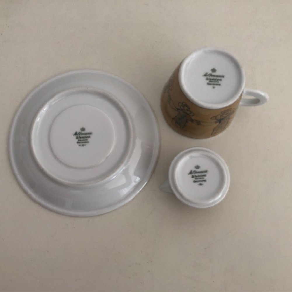 Funny 3 piece set by Seltmann Weiden Bavaria Germany; cup with saucer and a small milk jug stacked on top of it.