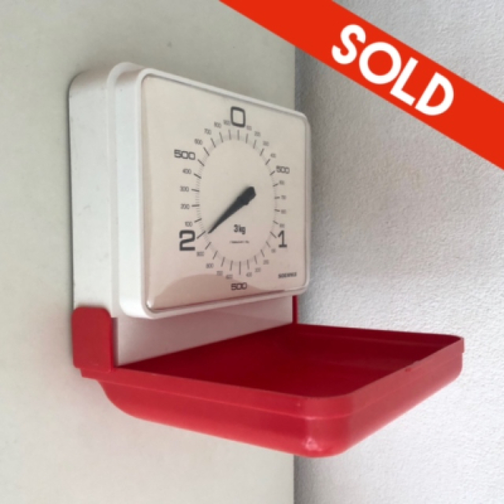 Retro kitchen scale from the sixties - seventies in the colors: red an white. A beautiful space age design wall schale for easy use in the kitchen. If you want to weigh something, you pull the red part towards you, when you are done you push it back in it's place, so it is also saving you space. A gorgeous compact designed scale. It is in a good vintage used condition, see pictures.