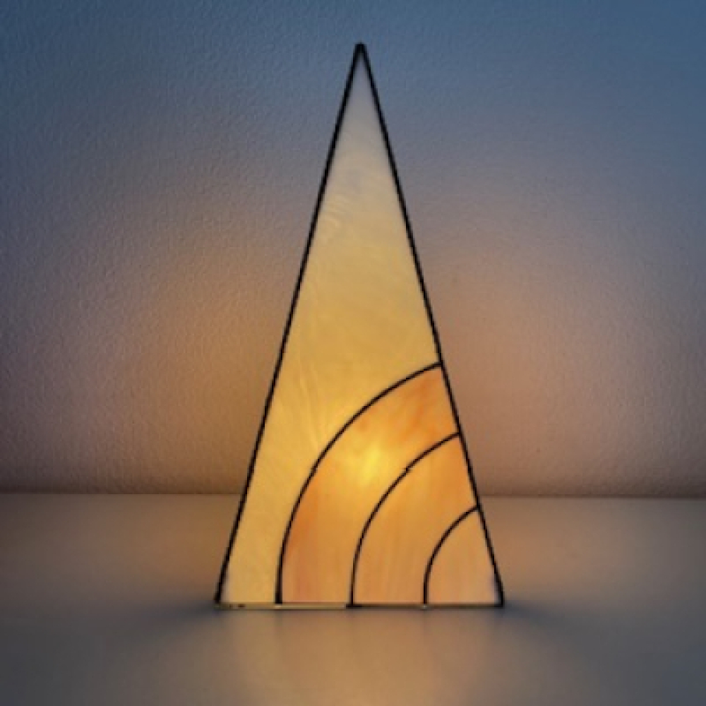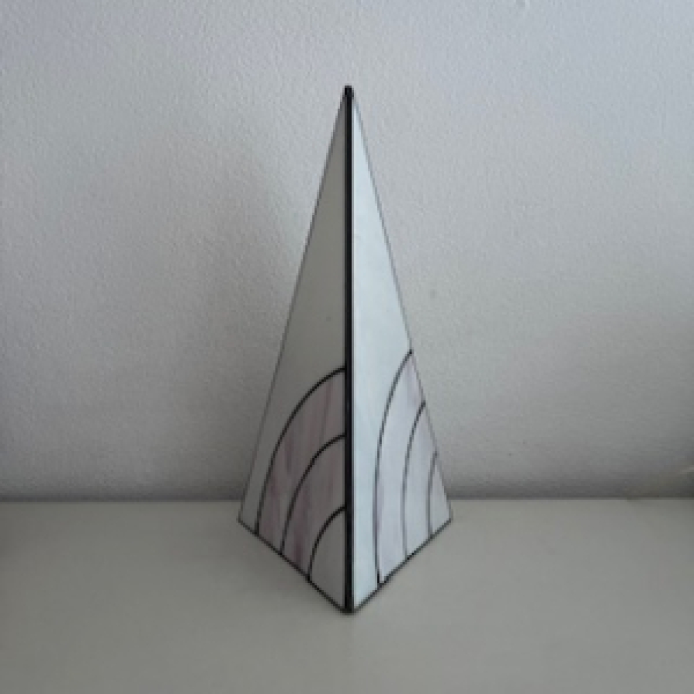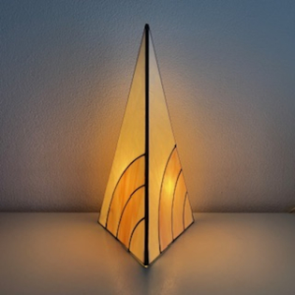 This beautiful lamp is in Tiffany's style shaped like a 3D triangle. The stained glass lamp has creme white, beige, light grey glass shade in lead. It is in a very good vintage condition, see pictures. The pictures are part of the description.