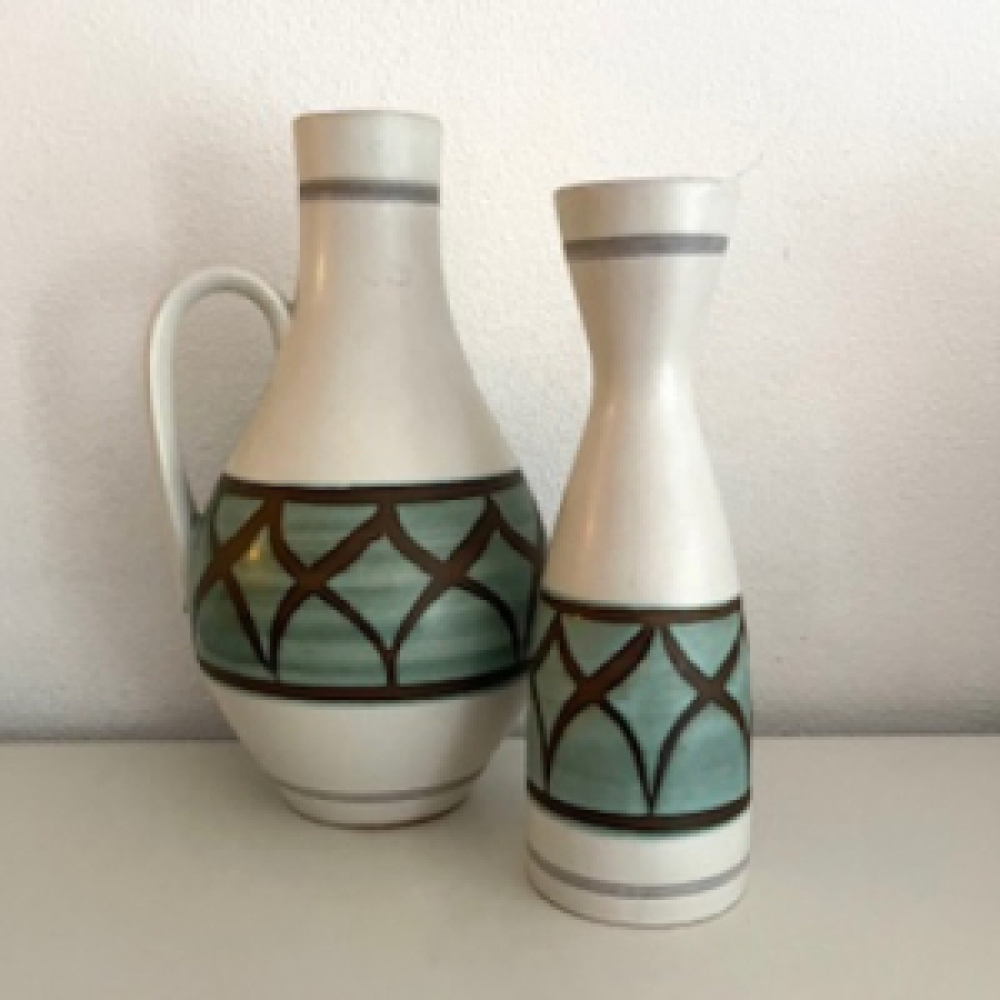 De twee vazen komen uit dezelfde serie en zijn beide in een goede vintage gebruikte conditie. De foto's behoren tot de omschrijving. Stuur bij interesse naar meer foto's of informatie ons een mail.