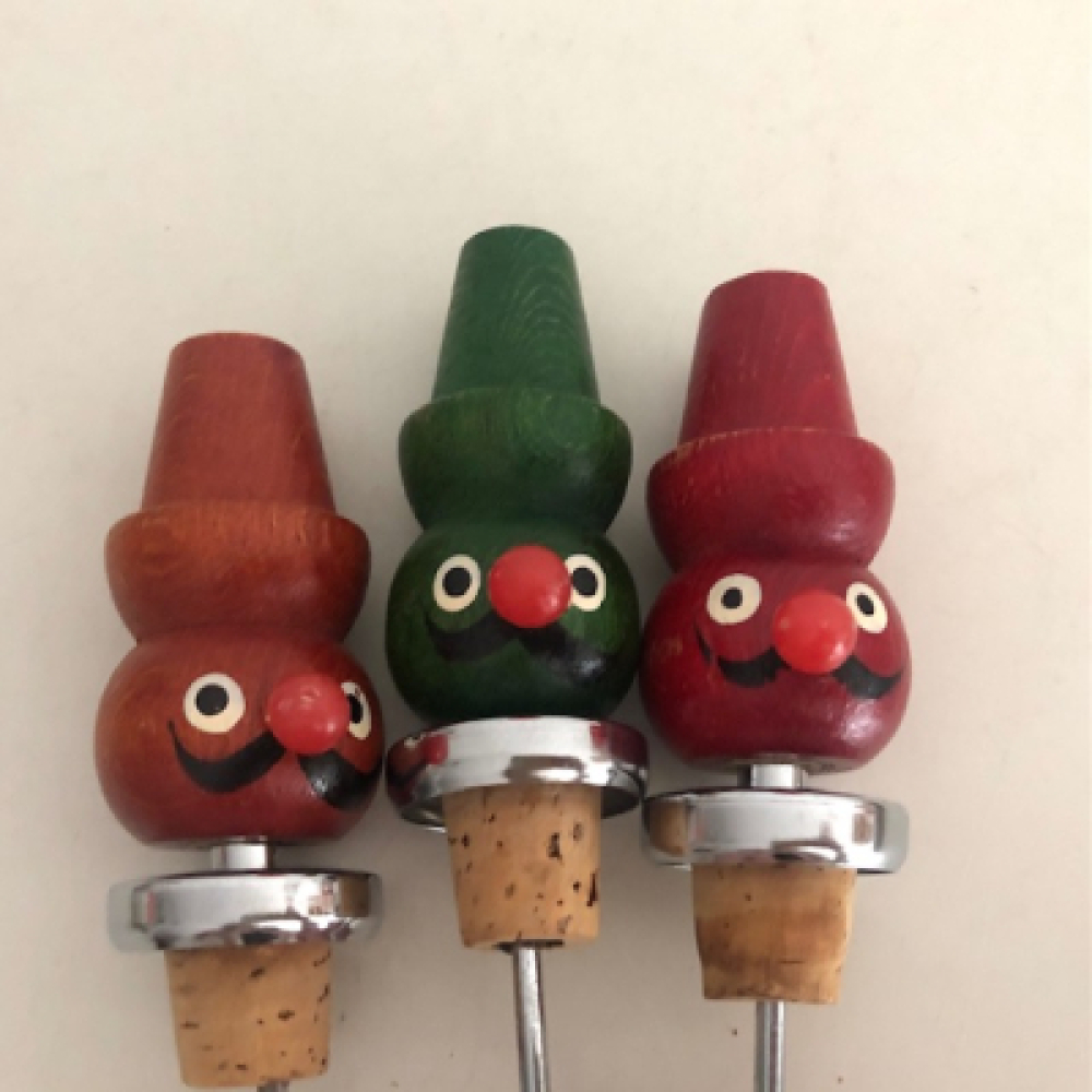 Scandinavische jaren '50 - '60 schenktuiten / flessenstoppen in de vorm van een hoofd van mannetjes in 3 verschillende kleuren. De tuit met kurk wordt op de opening van een (likeur) fles geplaatst, waardoor je gemakkelijker gepast kan schenken. In de stijl van Hans Bolling / Kay Bojesen. Ze zijn in een goede vintage gebruikte conditie, zie foto's. De foto's maken deel uit van de omschrijving. De prijs is een set prijs voor de 3 tuiten samen.