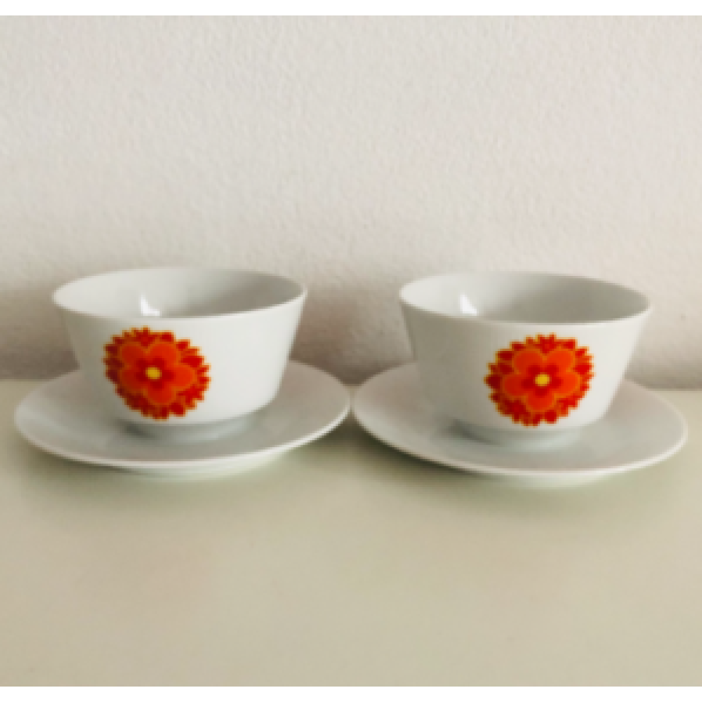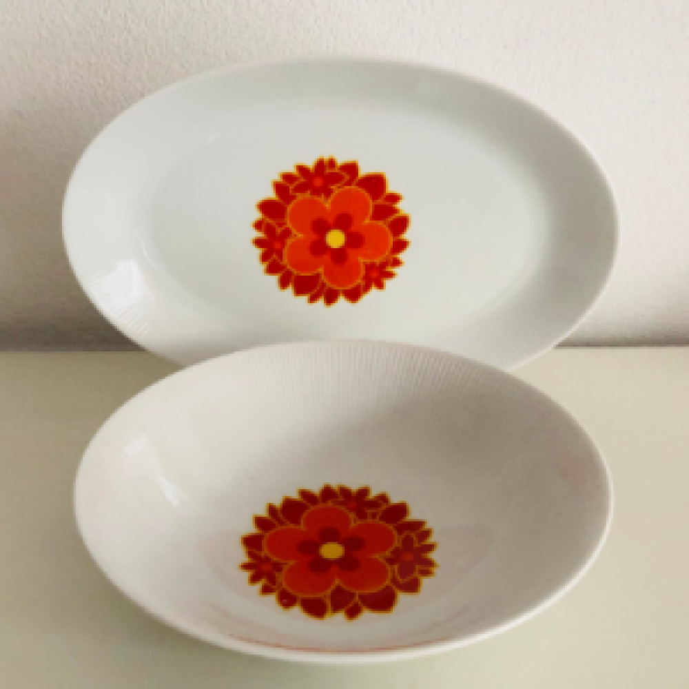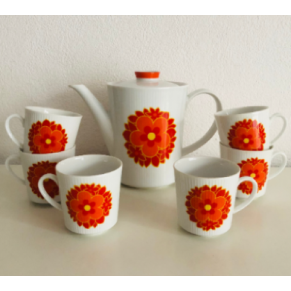 Flower Power servies, gemerkt Winterling Marktleuthen Bavaria - Germany met oranje / rode bloemen decor. De set is in een goede vintage gebruikte staat, alleen de dinerborden zijn in een mindere conditie. Een super leuke retro set!!