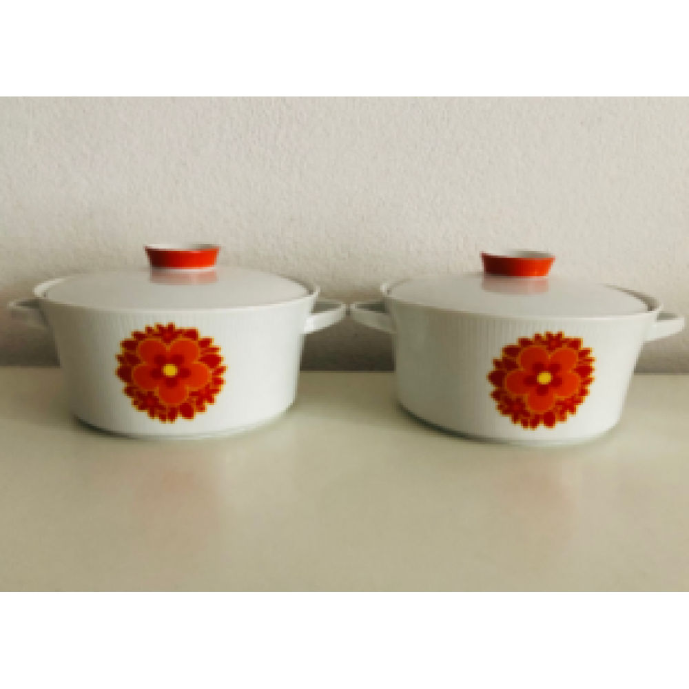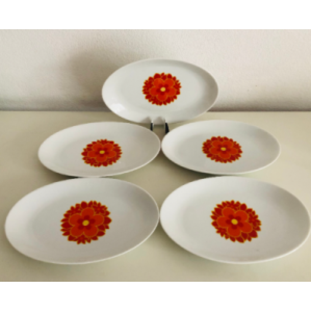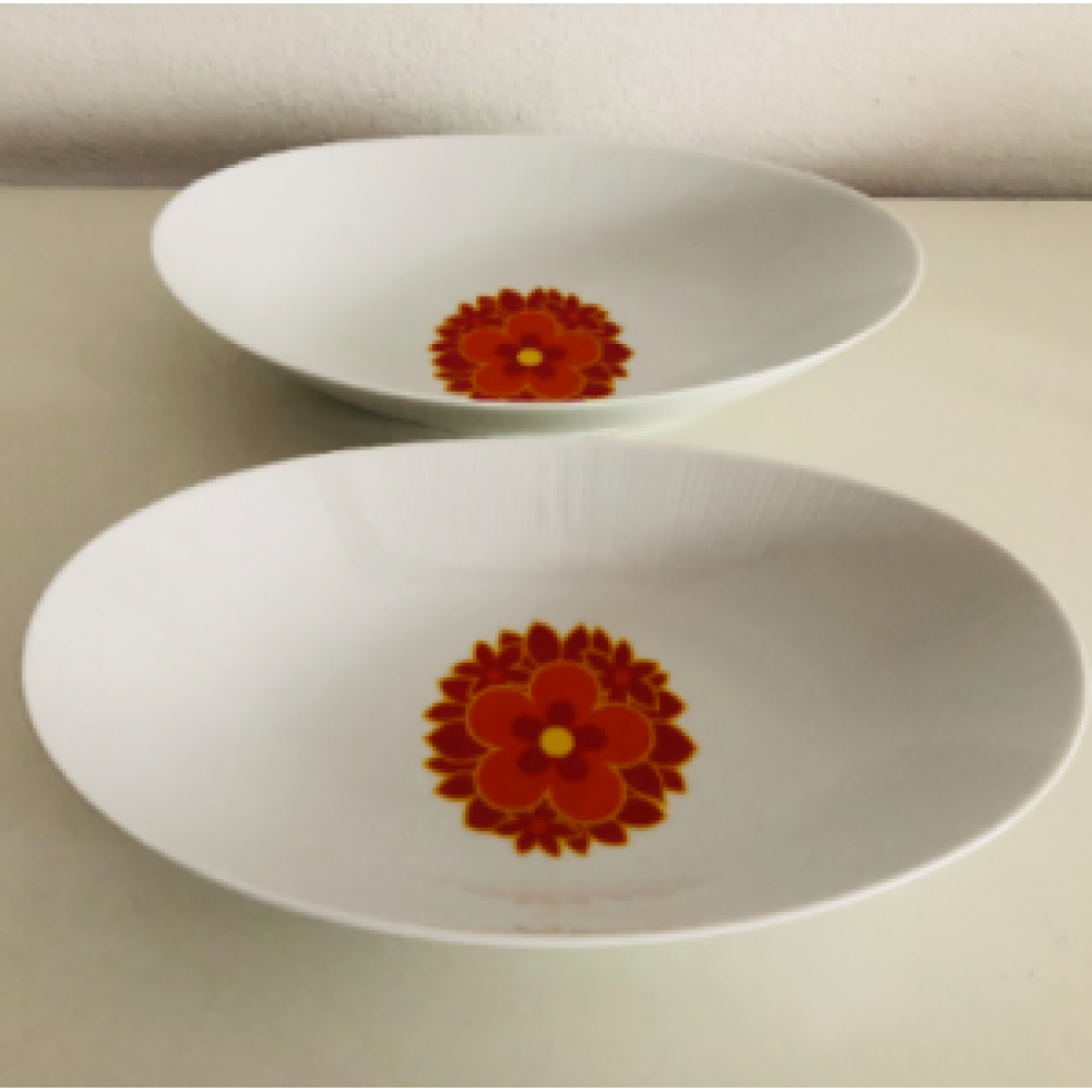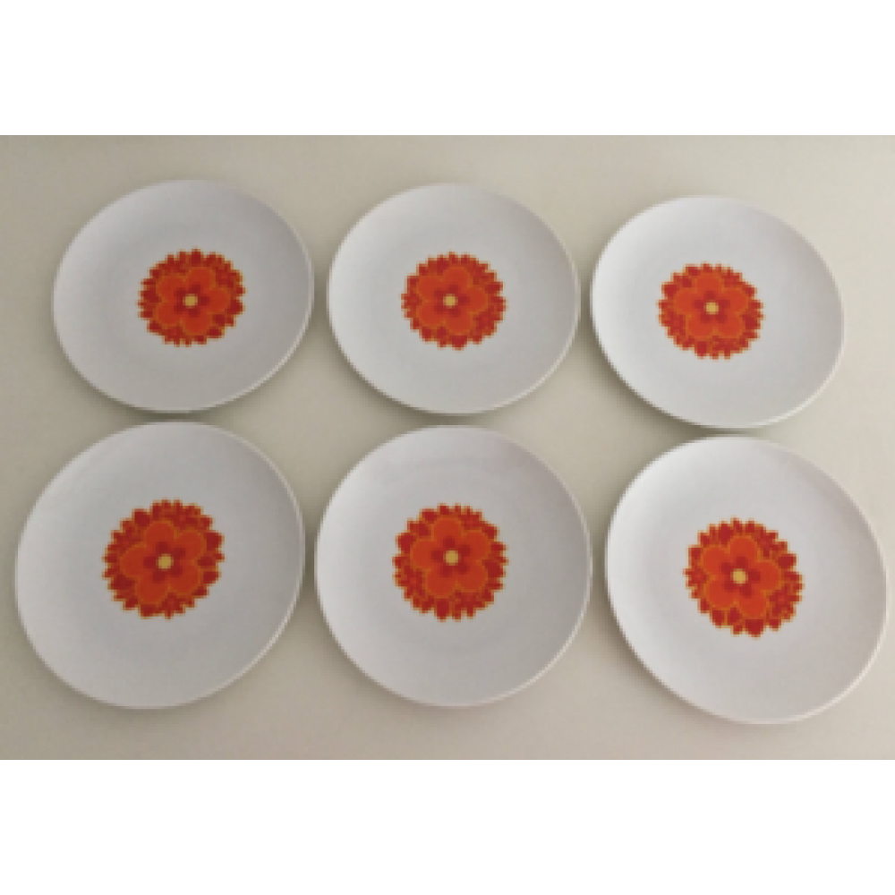 Flower Power servies, gemerkt Winterling Marktleuthen Bavaria - Germany met oranje / rode bloemen decor. De set is in een goede vintage gebruikte staat, alleen de dinerborden zijn in een mindere conditie. Een super leuke retro set!!