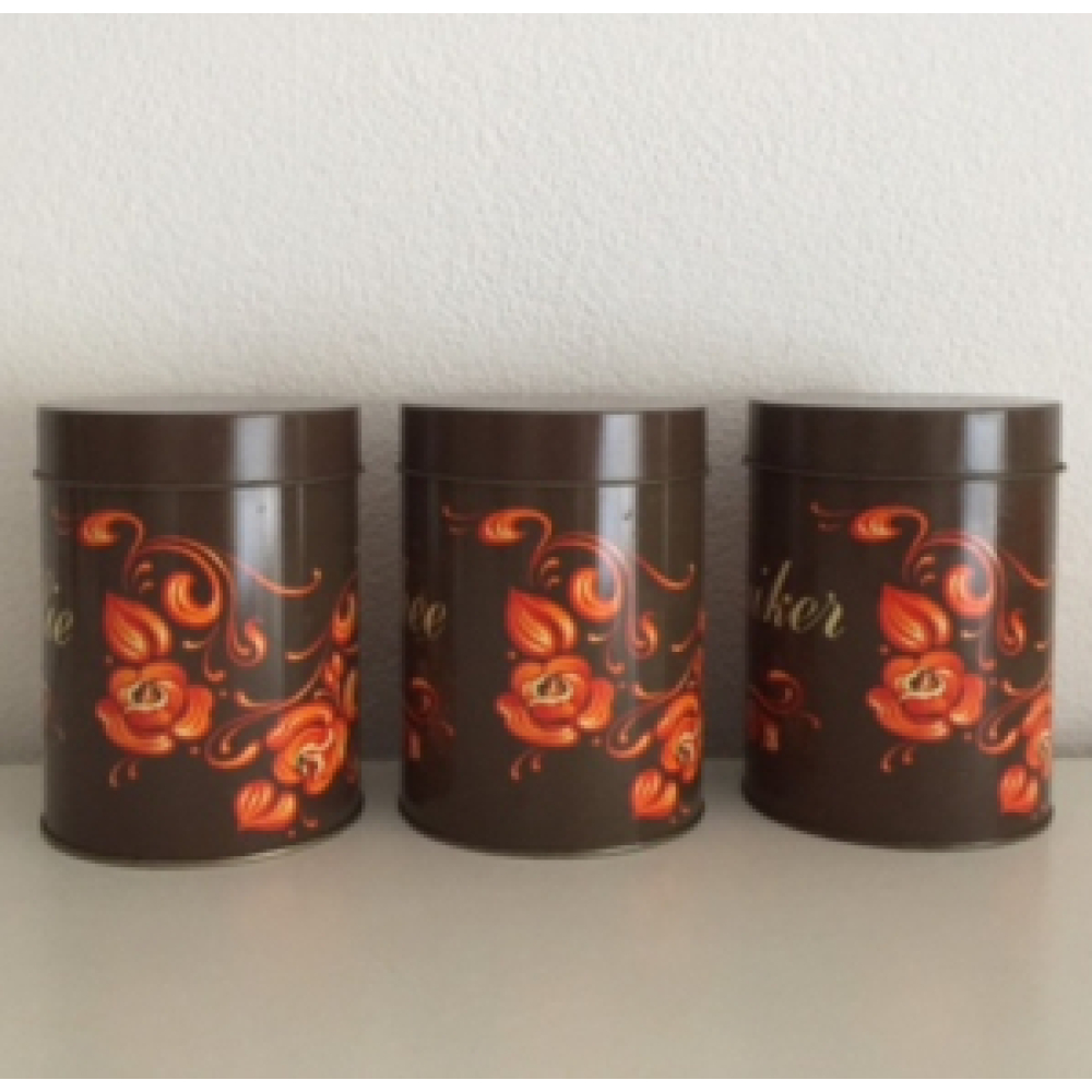 De voorraadblikken zijn voorzien van teksten: Koffie, Thee en Suiker