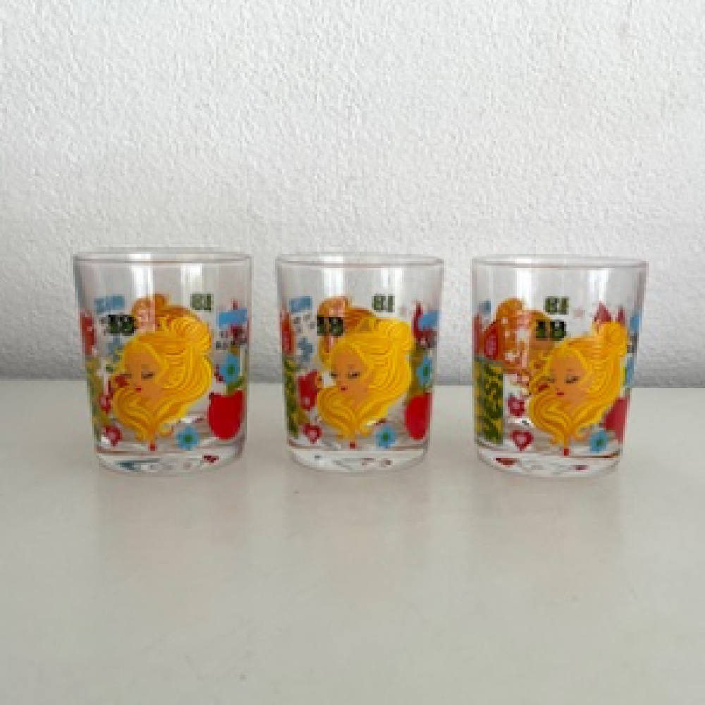 Leuke glaasjes uit de jaren '60 - '70 met een funky decor. De glaasjes kunnen als mix (op de print staat 1/3 Gin met 2/3 soda) glaasjes gebruikt worden of gewoon als sapglazen. Dit setje bestaat uit 3 glazen met een leuke groovy seventies print. Ze verkeren in een goede gebruikte conditie, zie foto's. De foto's maken deel uit van de omschrijving.