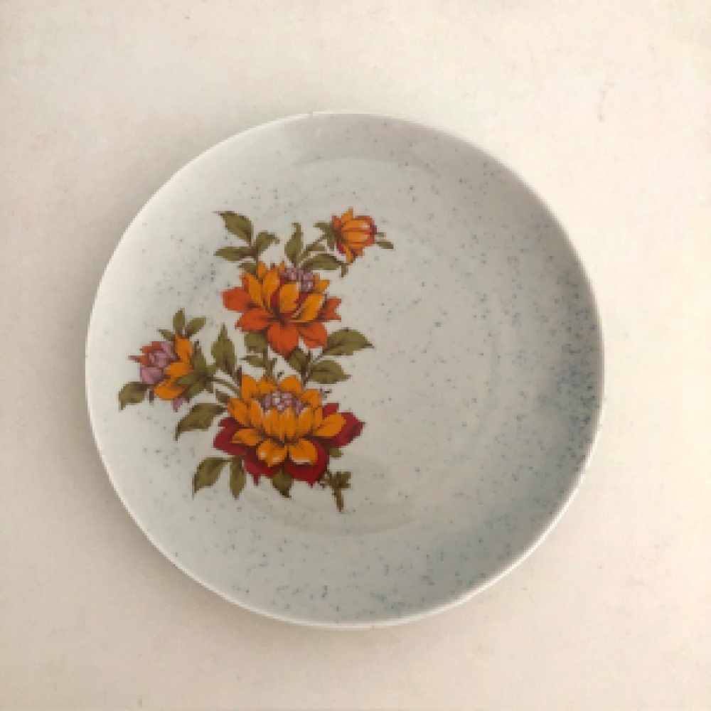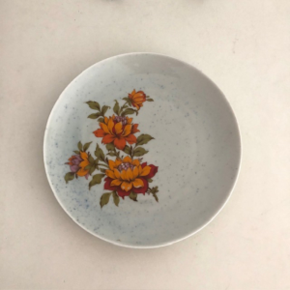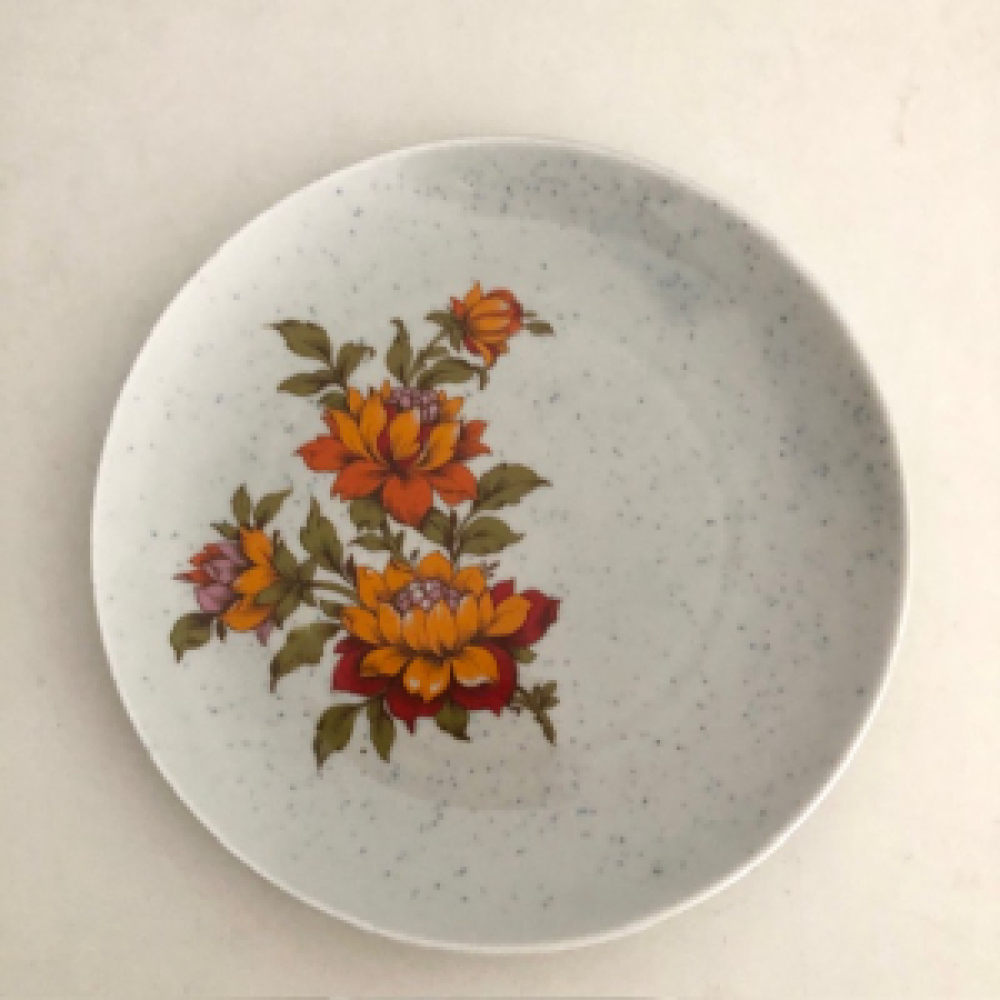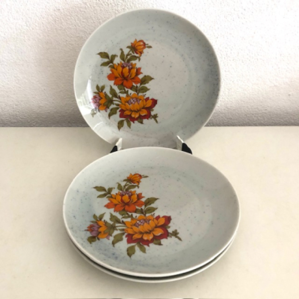 Mooie Winterling ontbijt borden origineel uit de jaren '60 - '70; grijs met blauwe spikkels en grote oranje bloemen decor.