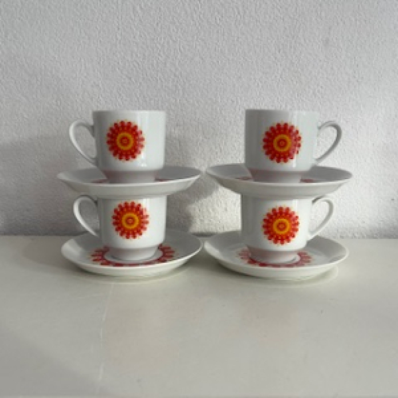 Origineel uit jaren '60 - '70; set van 4 kop en schotels met oranje bloemen print.