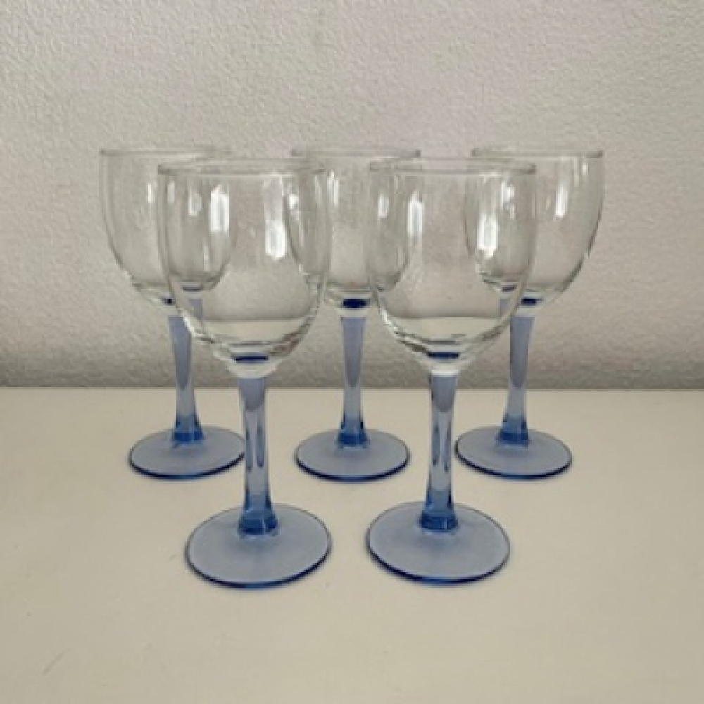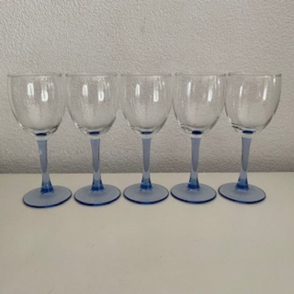 Mooie design kristal glas wijnglazen met blauwe voet. Ze zijn alle vijf in een zeer goede vintage gebruikte conditie, zie foto's.