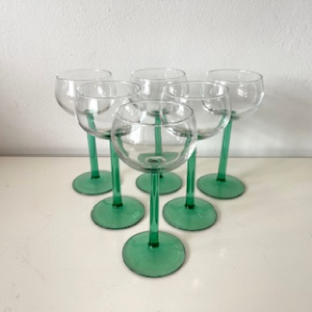 Mooie vintage wijnglazen met groene rechte voet. Origineel uit de jaren zestig - zeventig.