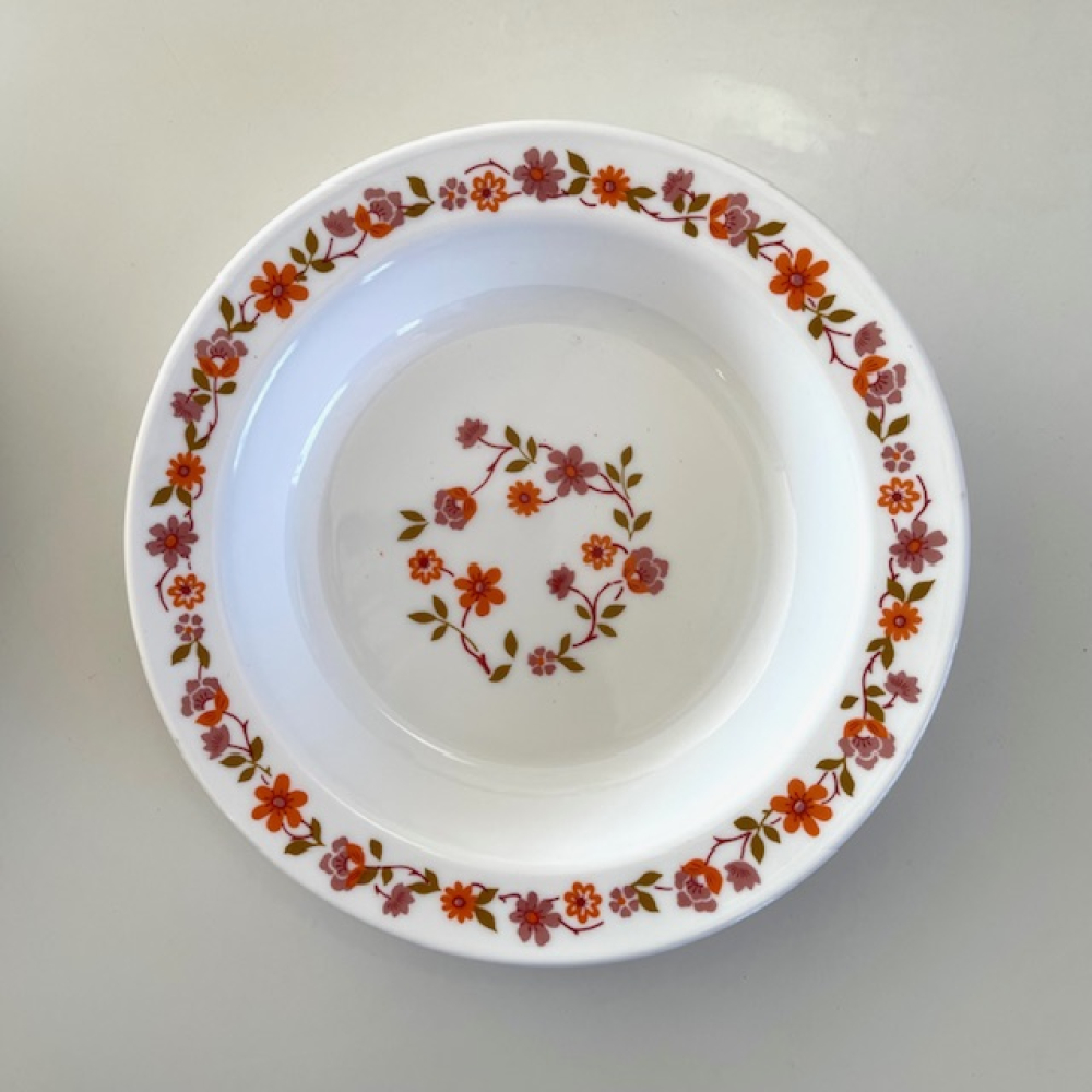 Leuke pasta borden uit de Arcopal 'Scania' serie; witte diepe opaal glazen borden met oranje en lila gekleurde bloemetjes decor.