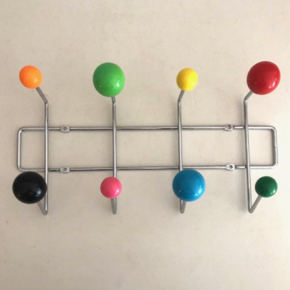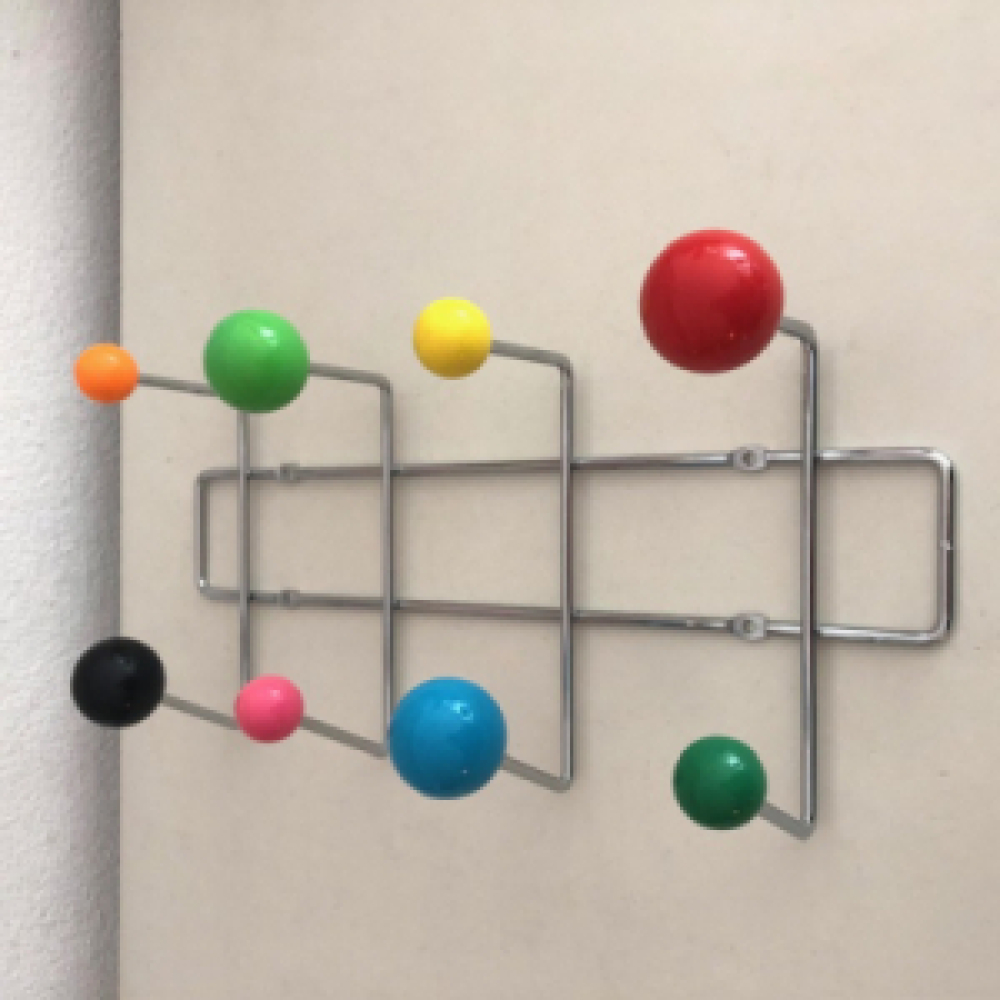Mooie wandkapstok met atomische uitstraling door de verschillende maten en gekleurde ballen.