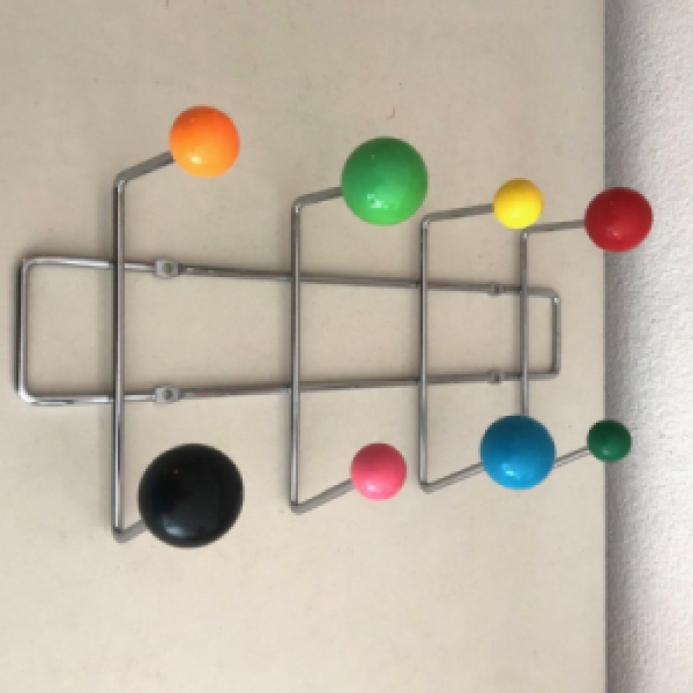 Het is verchroomd metaal met plastik gekleurde ballen / noppen in 2 verschillende maten en heeft 8 haken. De kapstok is in een goede vintage gebruikte conditie, zie foto's. De foto's maken deel uit van de omschrijving.