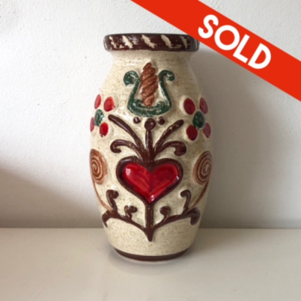 Bay retro vaas - West Germany. Funky beige vaas met rood, groen en bruine accenten; harten, bloemen en takken.