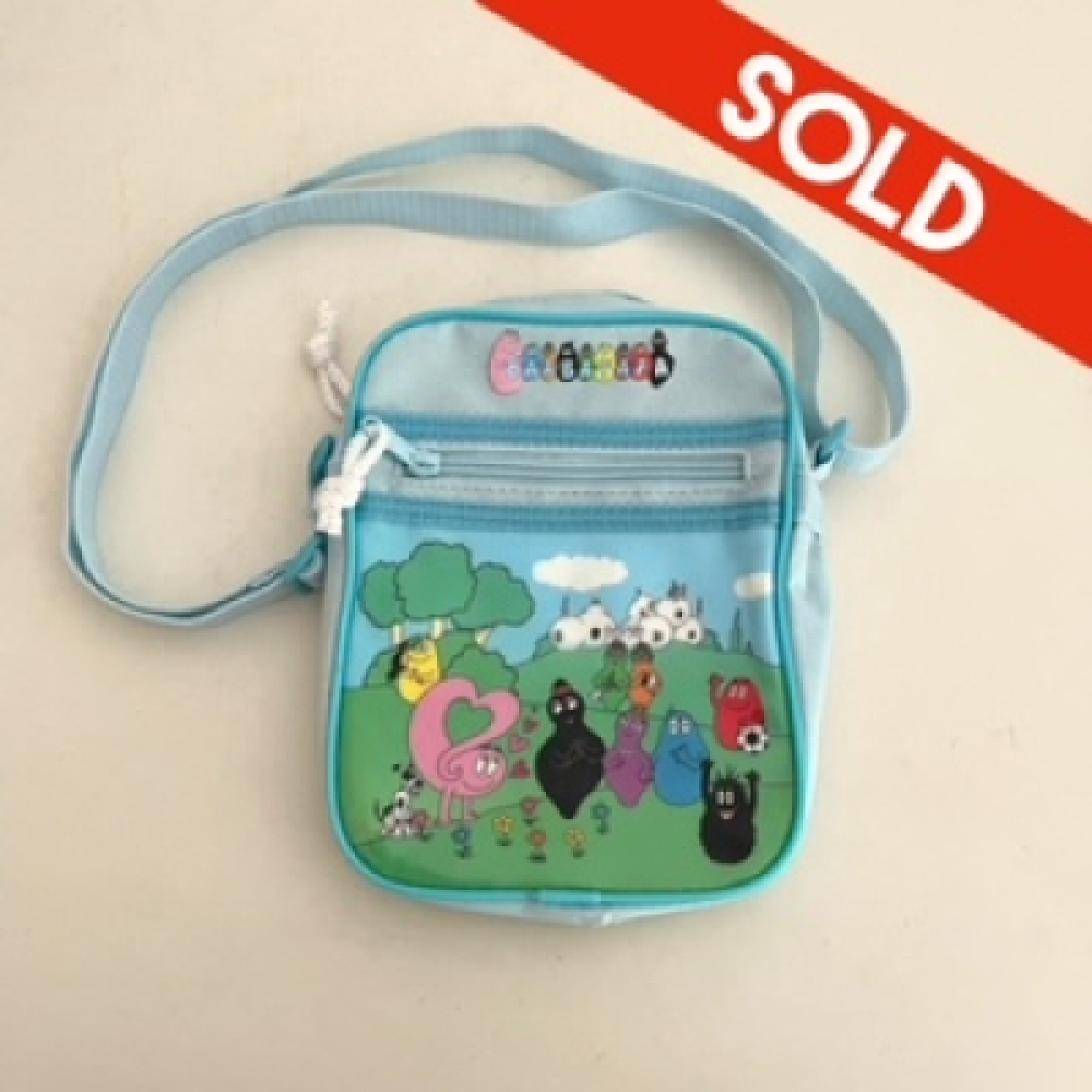 Retro blauwe Barbapapa schoudertas. Een klein blauw tasje om over de schouder te dragen met