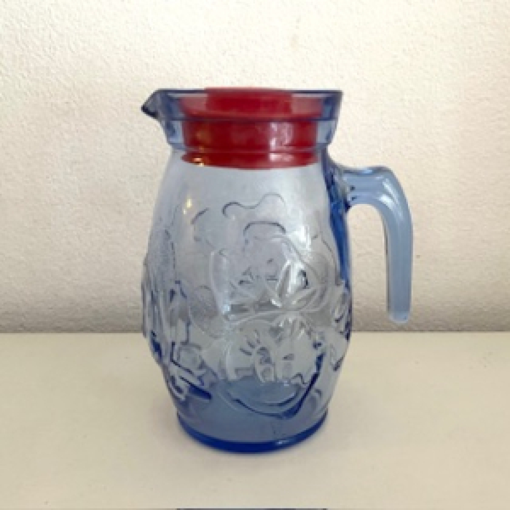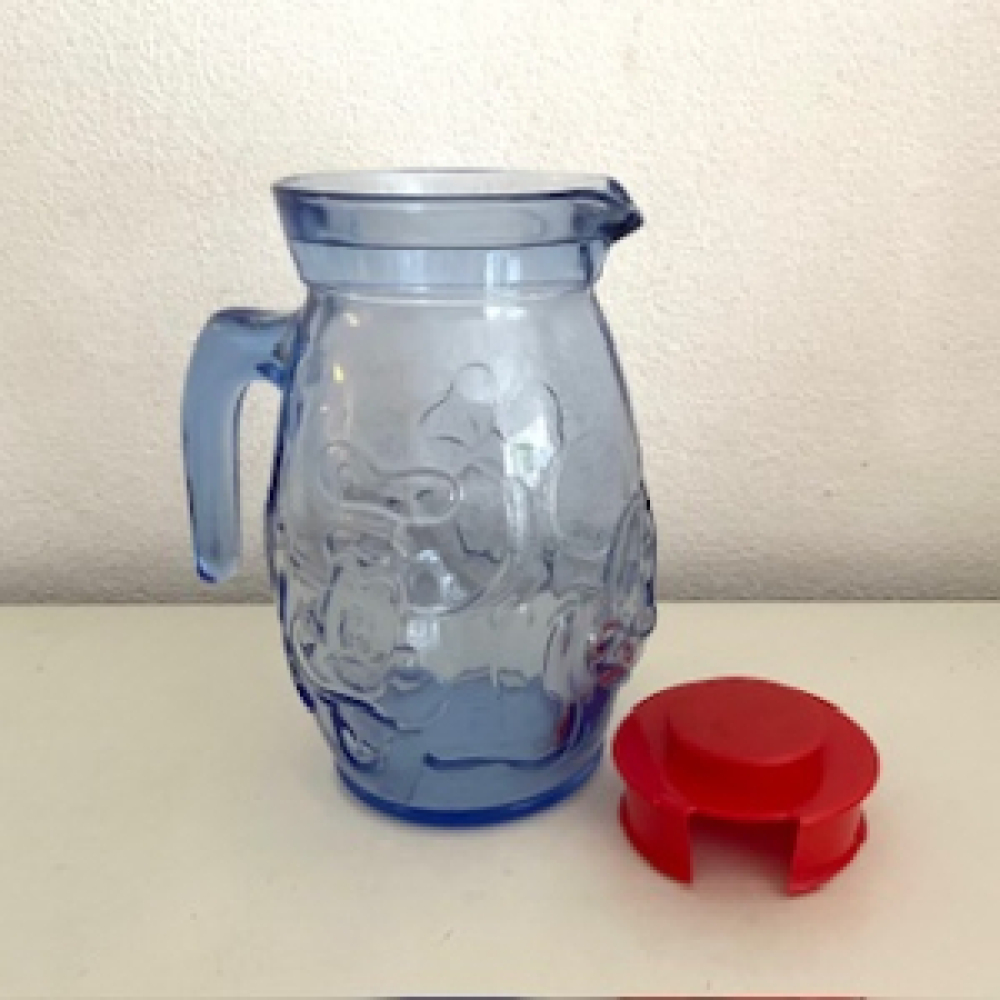 Leuke vintage blauw glazen schenkkan met 3D Disney karakter prints; Goofy, Mickey Mouse en Minnie Mouse. De glazen kan is originee uit de jaren '90 en is compleet met rode deksel / dop.
