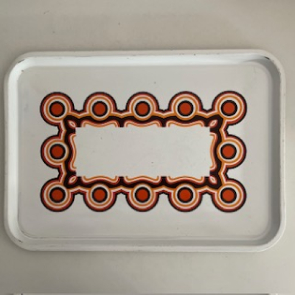 Mooi dienblad van Brabantia uit de Bayon-serie; wit metalen dienblad met oranje psychedelische cirkel print. Het is in een vintage gebruikte conditie en vertoont tekenen van gebruik, zie foto's. De foto's maken deel uit van de omschrijving.
