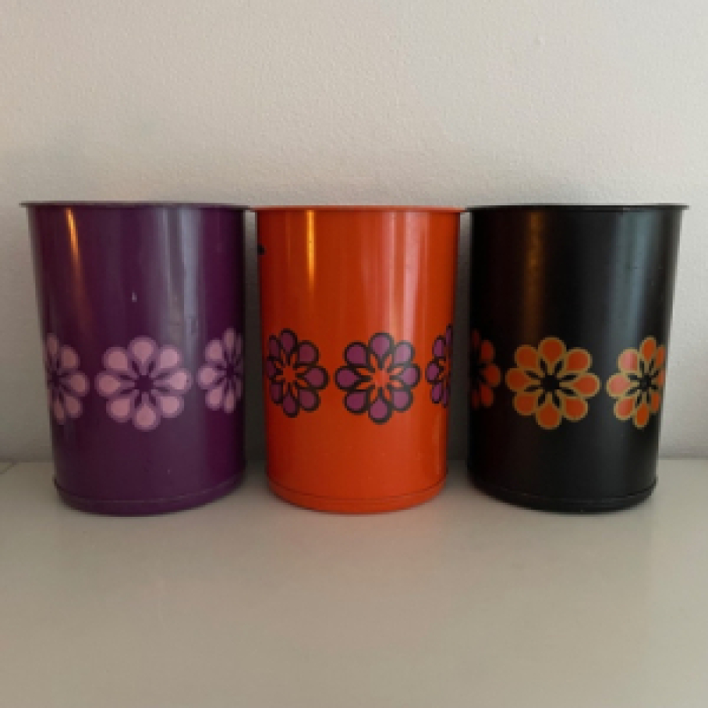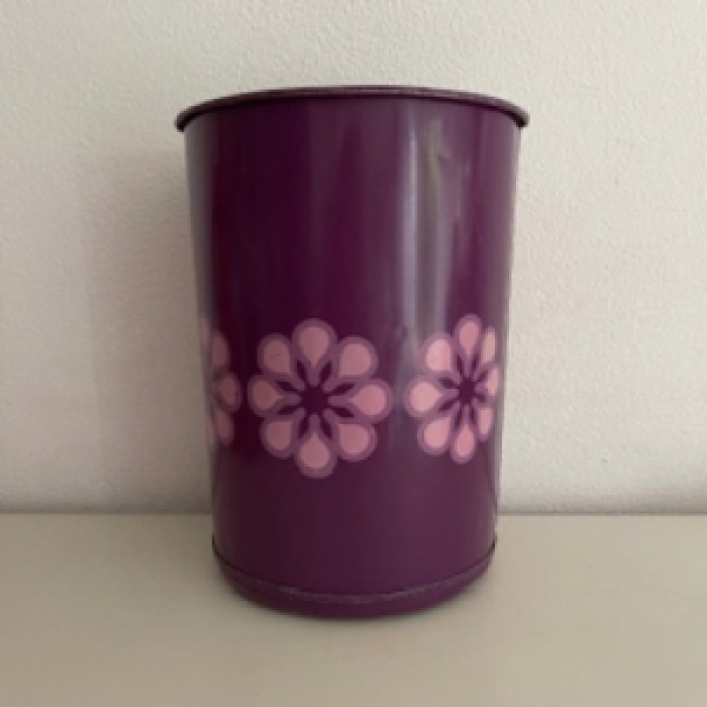 Paars metalen prullenbak - origineel uit de 60er 70er jaren. Productie vanuit Brabantia uit dezelfde serie met hetzelfde bloemen decor. Handige item voor in de kantoor of kinderkamer, maar zeker ook voor in elke andere kamer. Wij hebben momenteel 3 verschillende kleuren prullenbakken op voorraad en zijn alle drie in een vintage gebruikte conditie en heeft gebruikerssporen. De foto's horen bij de omschrijving. Graag horen wij als er meer foto's gewenst zijn.