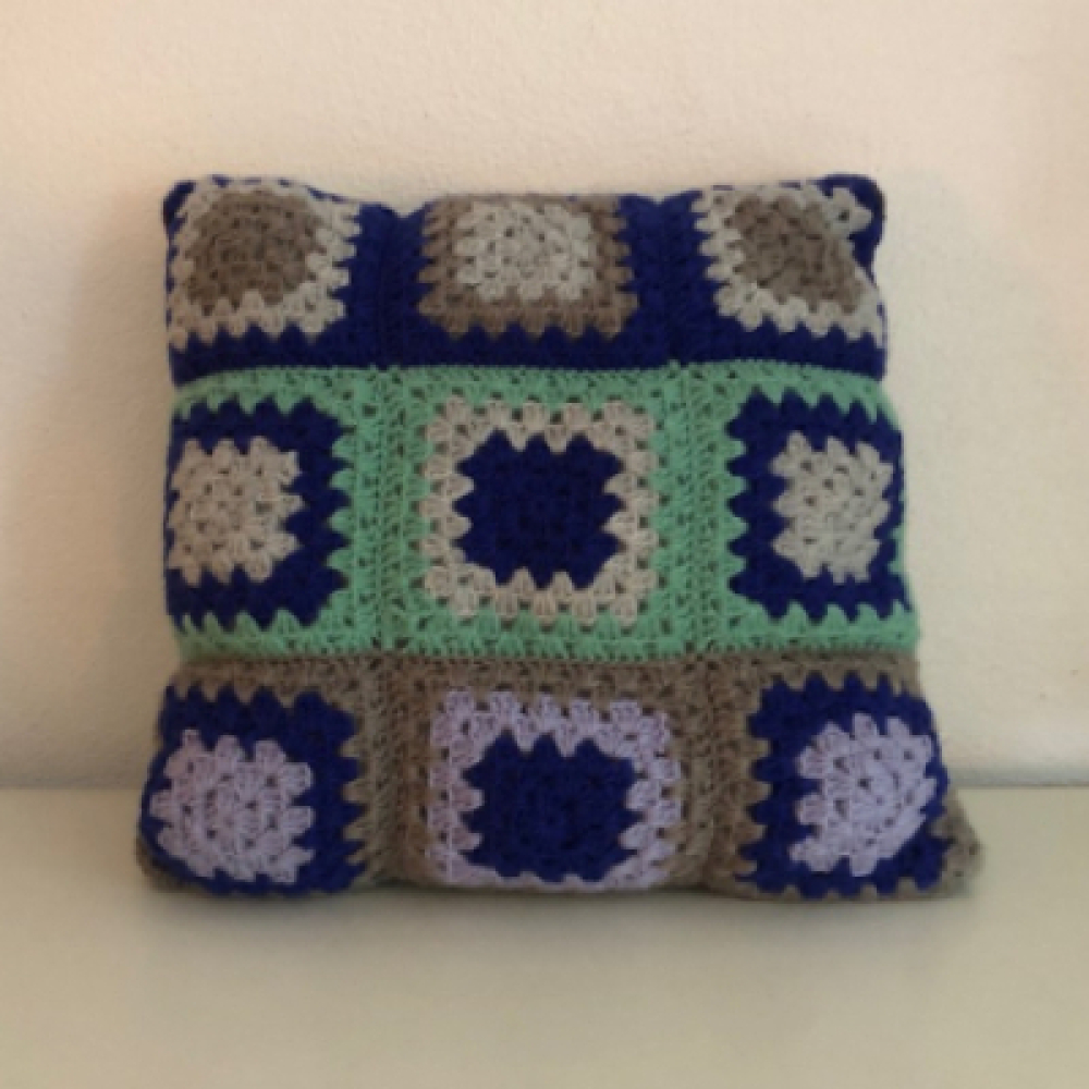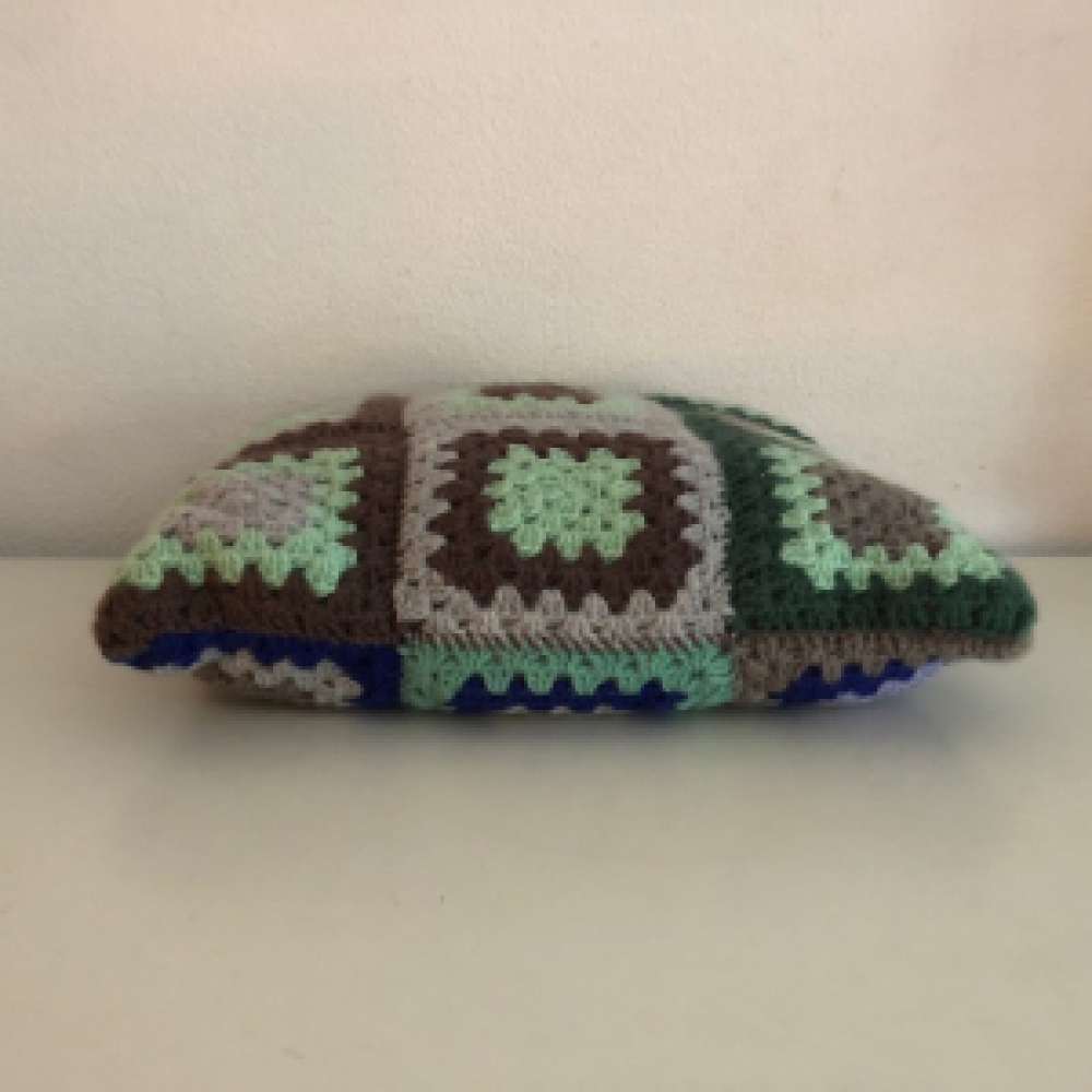 Het Granny square gehaakte kussen is in een goede vintage staat.