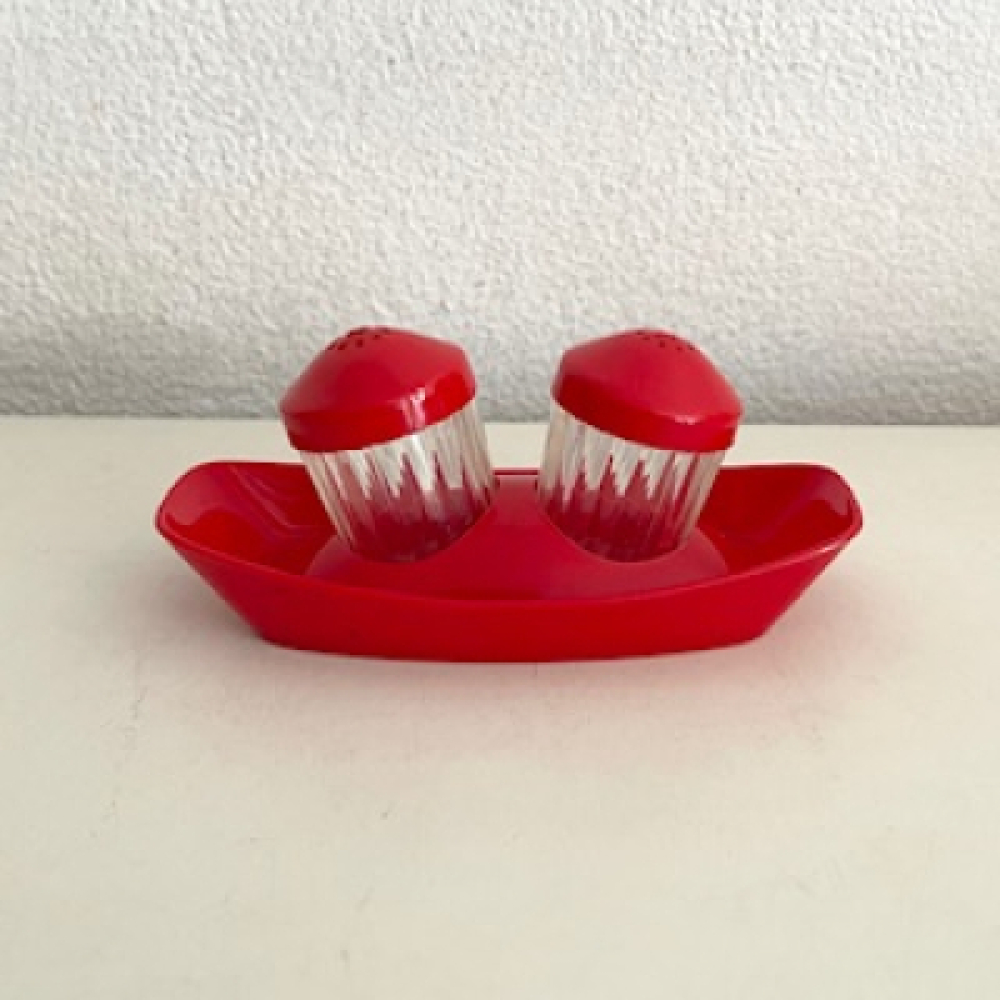 Vintage set Emsa peper en zout stel in rode houder / rekje. De vaatjes hebben een rode dop en een doorzichtig plastik vaatje. De 3delige set is in een goede gebruikte vintage conditie, zie foto's. De foto's maken deel uit van de omschrijving.