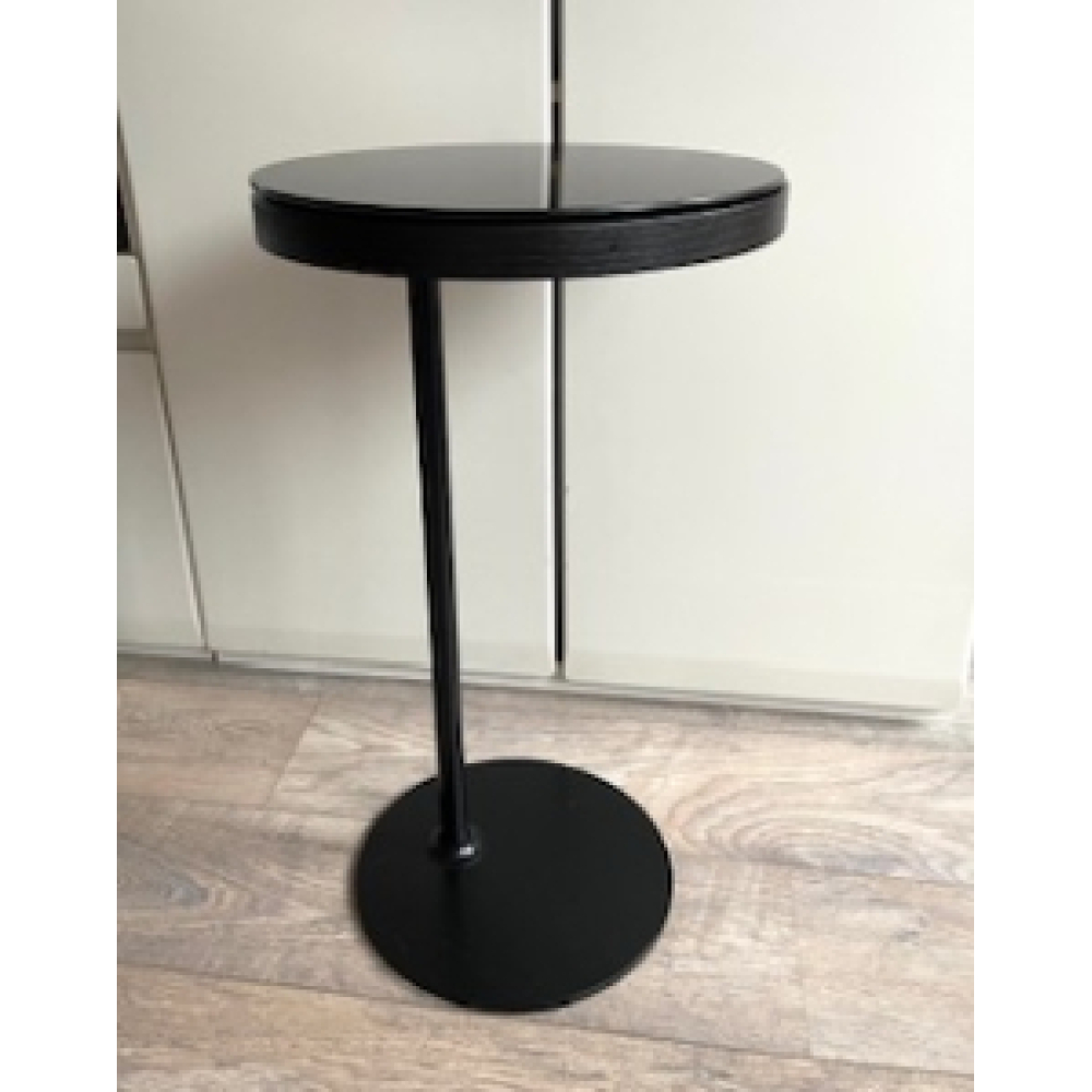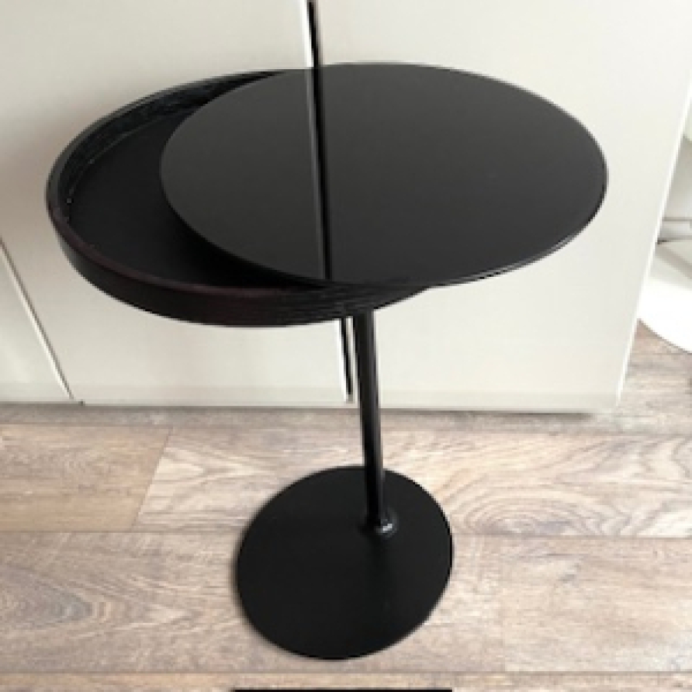 Zwart bijzettafeltje met een rond draaibaar glazen blad, waardoor er een kleine opbergruimte te voorschijn komt. Ontworpen door Eva Lilja Lowenhielm en uitgebracht door Ikea - Zweden. Handig voor het opbergen van 'geheime' spulletjes zoals; geld of verstoppen van snoepjes >.<