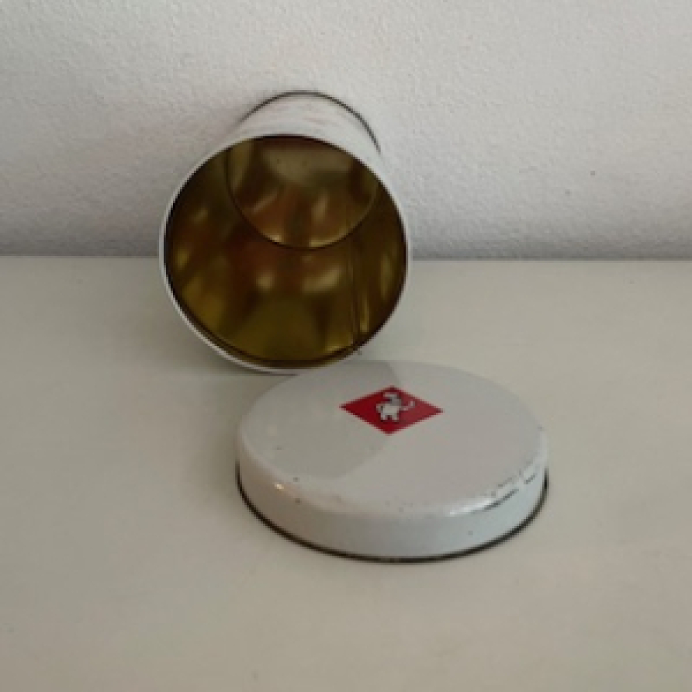 Vintage Bolletje beschuitblik uit de zestiger zeventiger jaren. Rond hoog blik met Fabeltjeskrant print; Truus de Mier en Mevrouw Ooievaar.