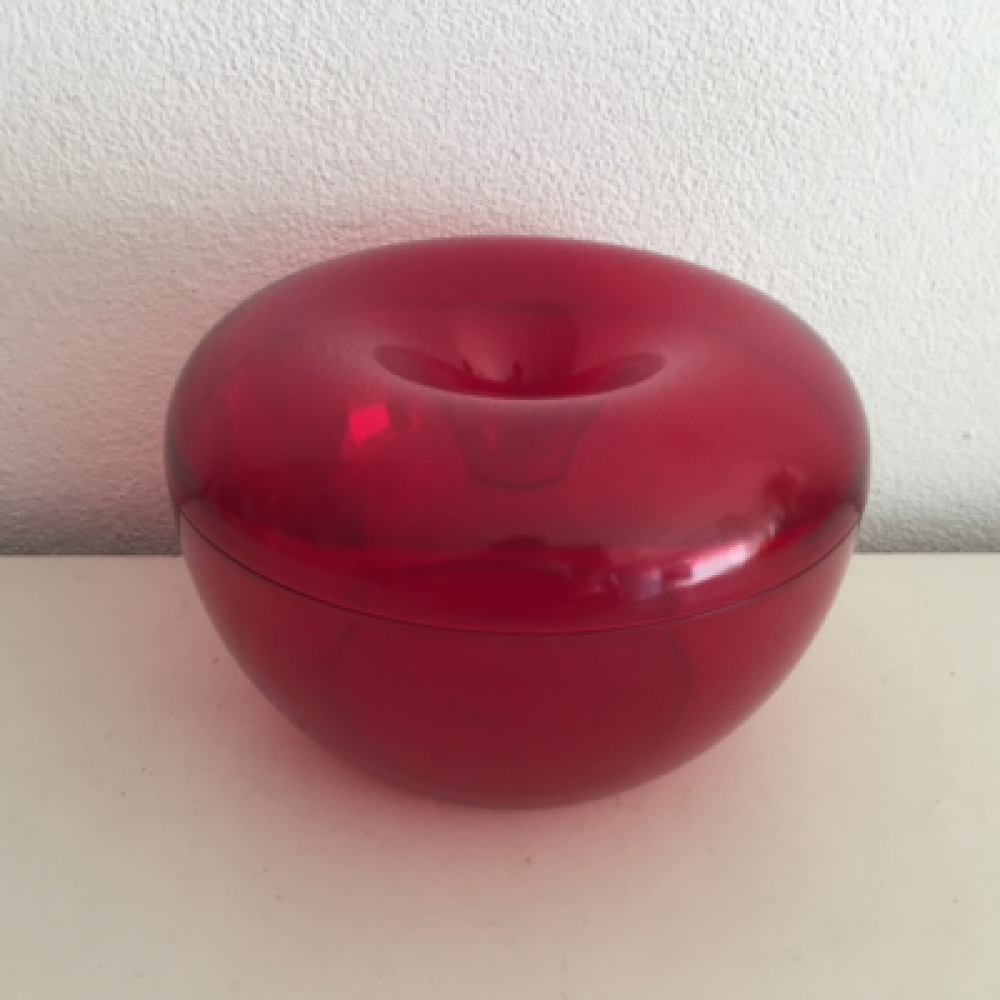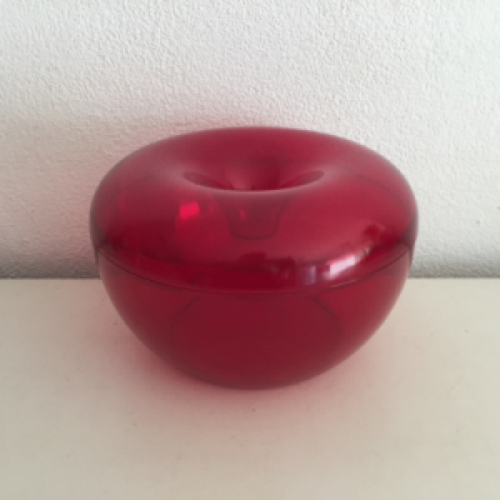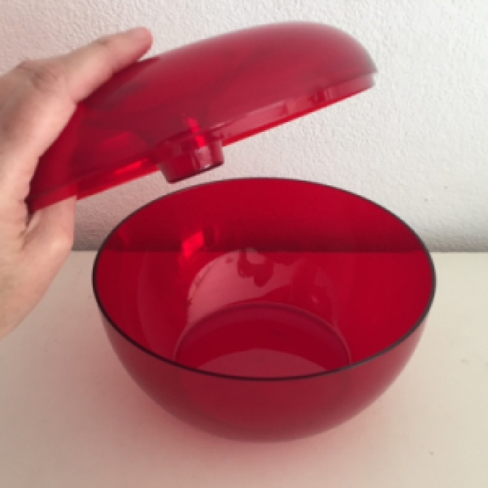 Mooie rode design schaal van Guzzini - Italië. De doorzichtige plexiglazen schaal met deksel kan gebruikt als saladeschaal, koekjestrommel, enz. en is uitgevoerd in de kleur rood. Het is in een goede gebruikte conditie, zie foto's. De foto's maken deel uit van de omschrijving.