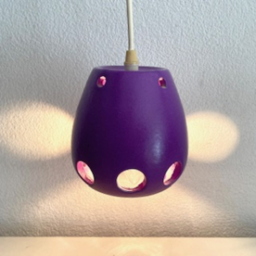 Jaren '60 - '70 hanglamp met een mooie in geglazuurde keramische lampenkap. Fantastische space age design style lamp in een paarse kleur. De hanglamp is in een goede gebruikte staat, zie foto's. De foto's maken deel uit van de omschrijving.