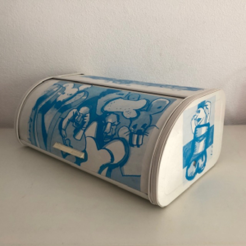 Ronde creme witte / blauwe broodtrommel met Herman Brood art decor van Brabantia uit de tachtiger jaren. Dit is een zeldzame uitvoering en is in een beperkte oplage uitgegeven.