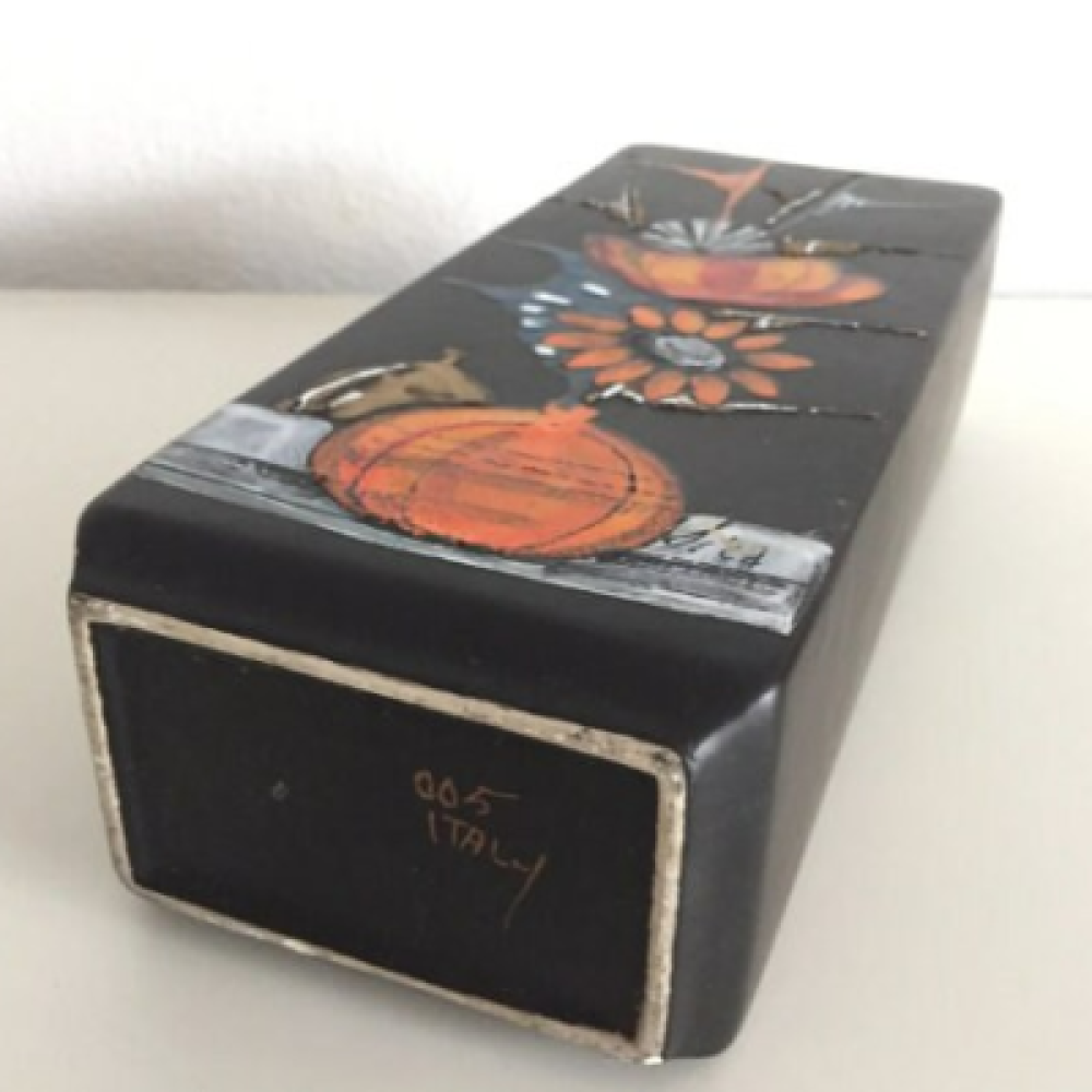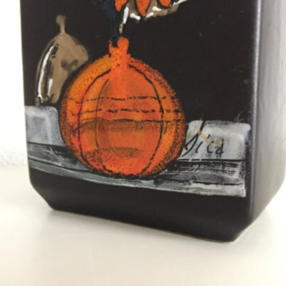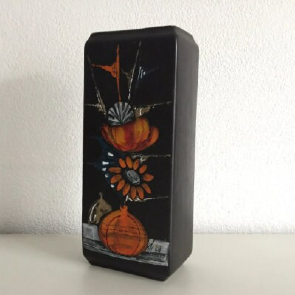 Prachtige vaas welke mooi met de hand beschilderd is door bedrijf Jica uit Italië. De zwarte keramische vaas heeft leuke abstracte bloemen afbeelding. Gewoon een beauty van een vaas, met of zonder bloemen erin! De vaas is in een zeer goede vintage conditie, zie foto's. De foto's maken deel uit van de omschrijving.