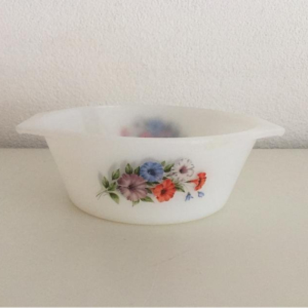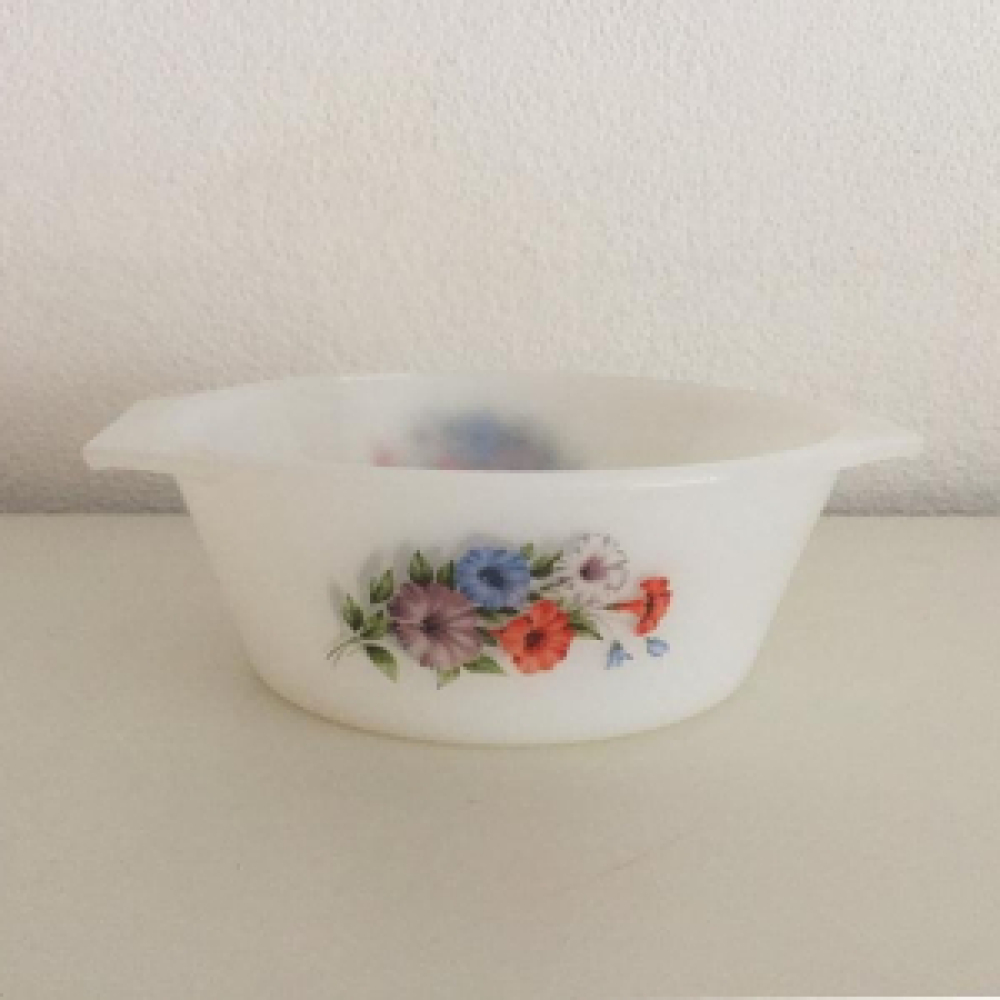 mooie ovenschaal van opaalglas met bloemen decor