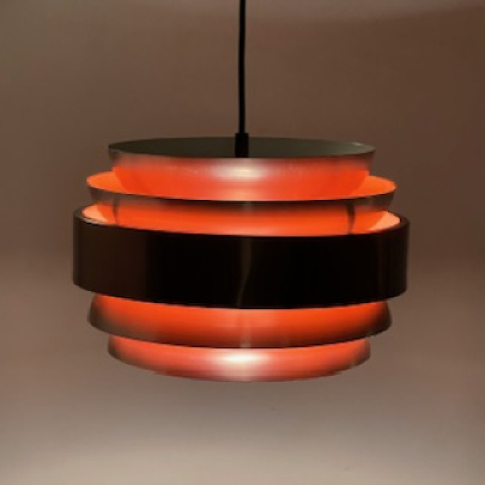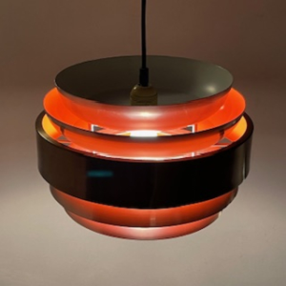 Fantastische space age design lamp uit de jaren zestig / zeventig van Lakro - Amstelveen. Gemaakt van metalen lamellen waarbij het licht het oranje aan de binnenkant er mooi doorheen laat schijnen, waardoor een warme sfeer kan worden gecreëerd. De hanglamp is in een goede vintage gebruikte conditie en kan tekenen van gebruik vertonen, zie foto's. De foto's maken deel uit van de omschrijving. Stuur ons een bericht indien u meer informatie of foto's wilt.