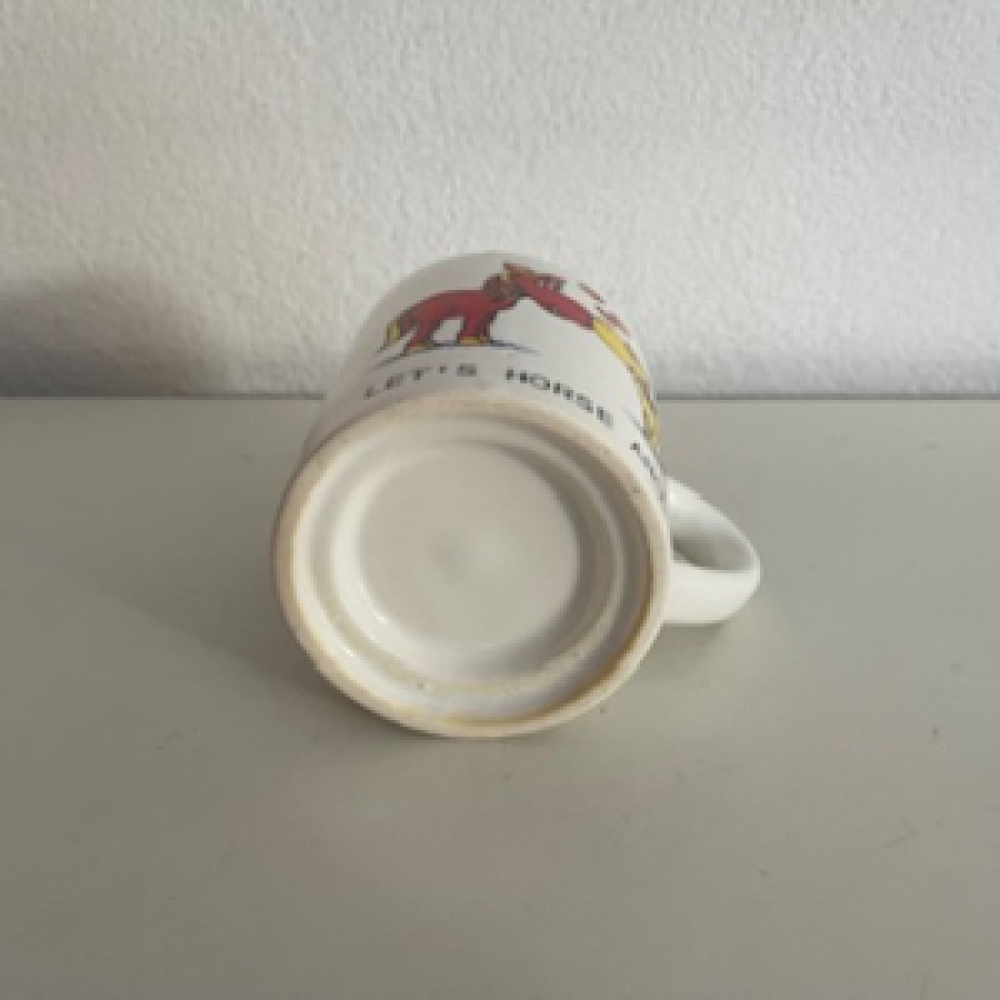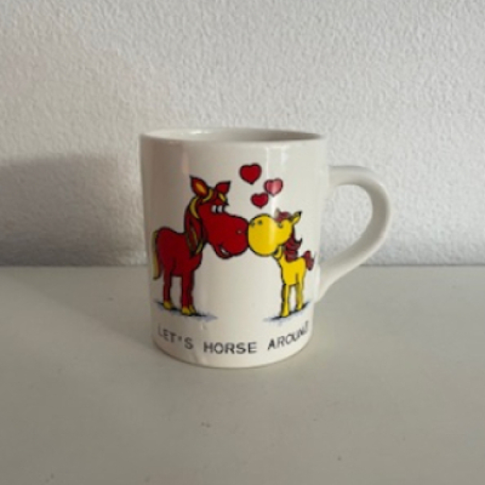 Leuke beker met grappige paarden afbeelding. Onder de cartoon staat "Let's horse around", wat 'laten we lekker gek doen' betekend. De mok is in een goede vintage gebruikte conditie, zie foto's. De foto's maken deel van de omschrijving.